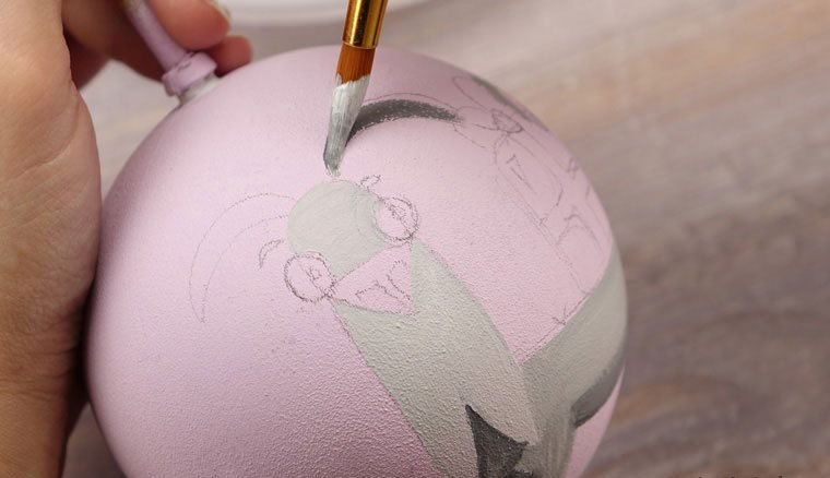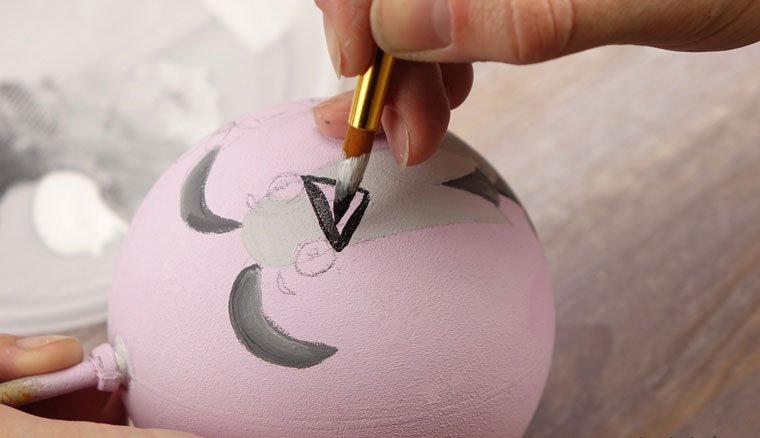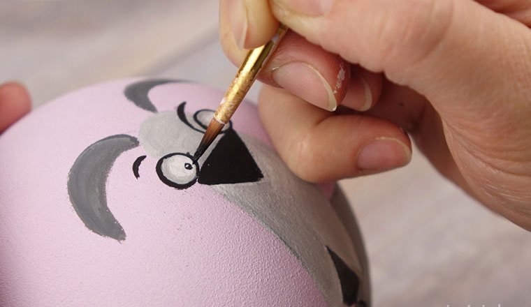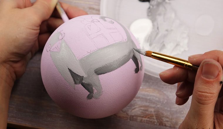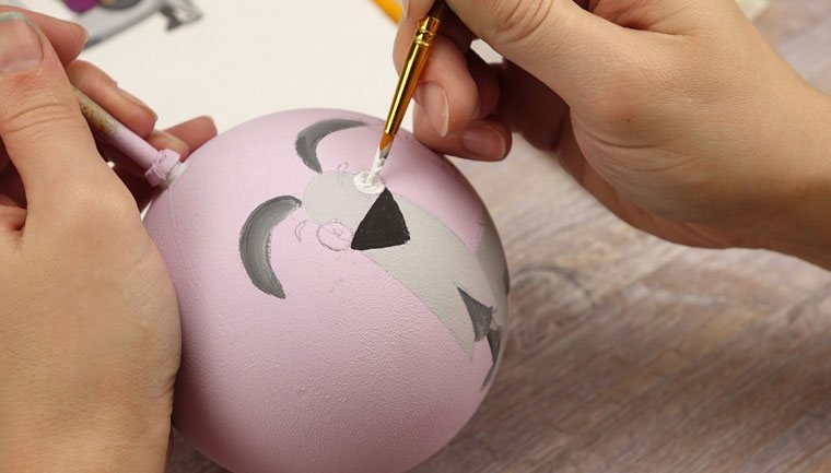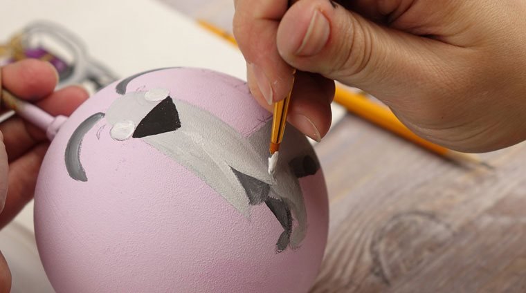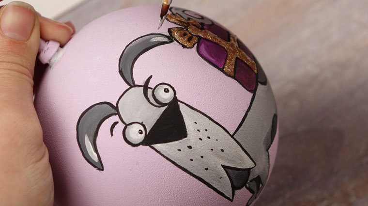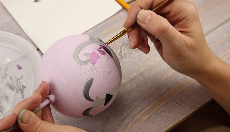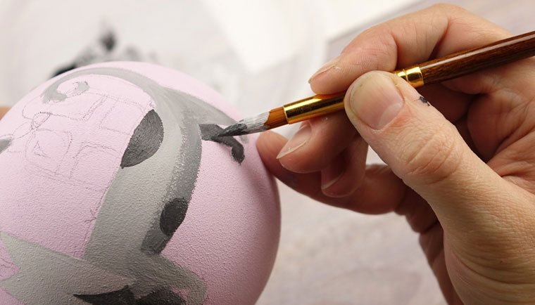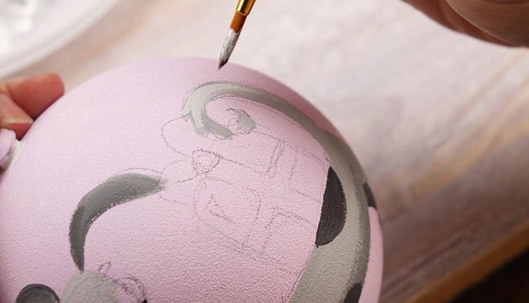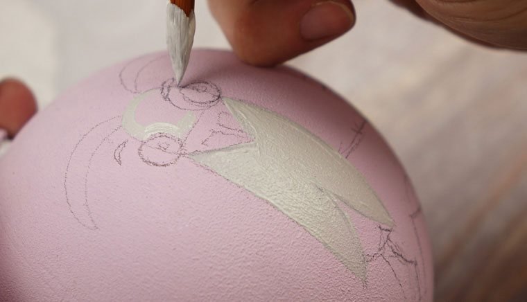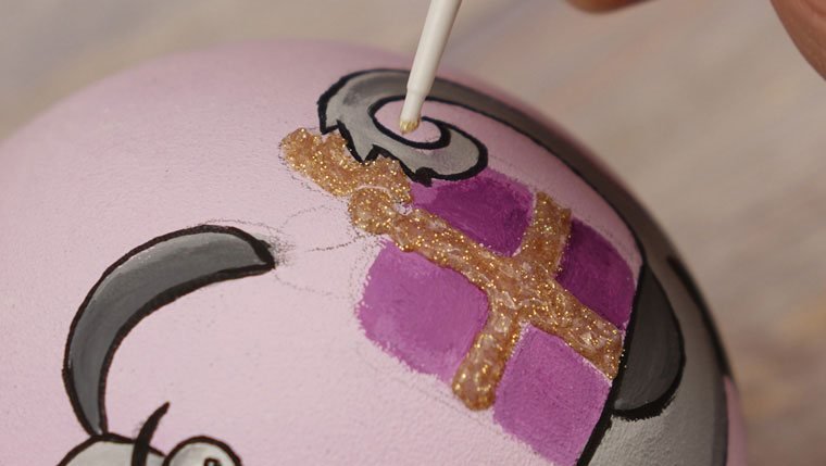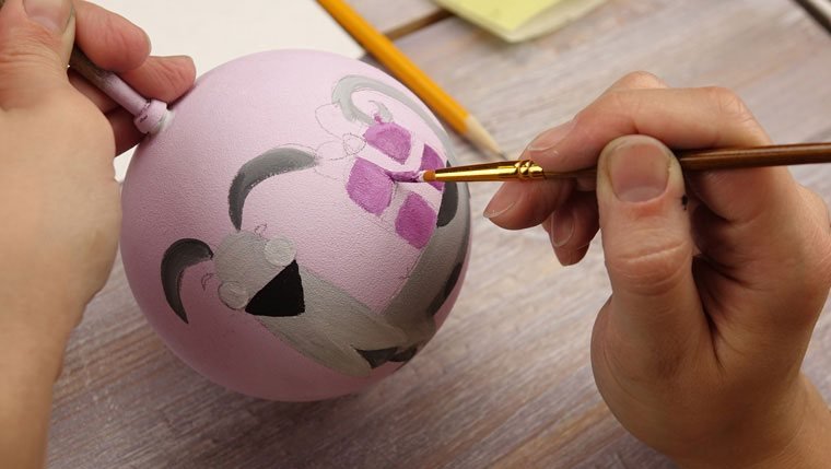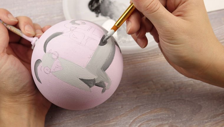 Перед началом работы надо подобрать рисунок. Затем аккуратно перенести идею простым карандашом на заготовку. Узор может располагаться с одной стороны или охватывать всю круглую поверхность игрушки. Обводим краской подготовленную картинку. Чтобы контур не смазывался, можно сделать его в несколько слоев, дождавшись высыхания предыдущих мазков. После окончательного высыхания вытираем ластиком штрихи от простого карандаша.