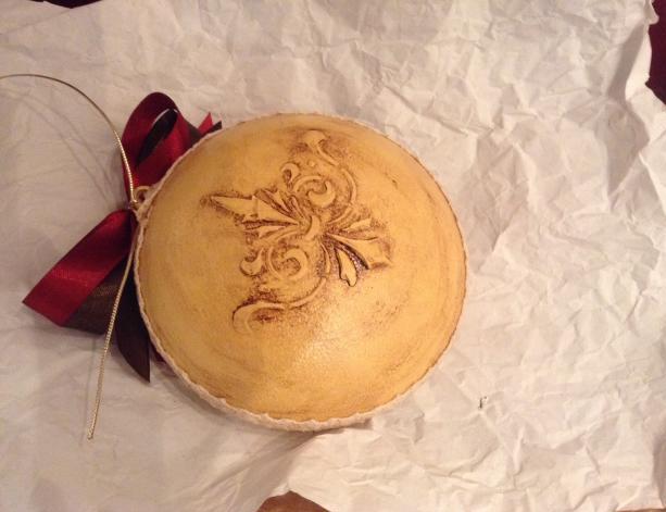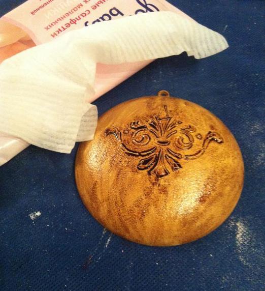 Вырезаем несколько одинаковых узоров из салфетки. Прикладываем один рисунок к шару и приклеиваем. Разравниваем кисточкой края и оставляем заготовку сохнуть на несколько часов. Также необходимо сделать с остальными. Затем игрушку покрываем лаком и наносим текстурные элементы. Пастой или глиной можно обработать контур узора, добавить любой рельефный элемент. После высыхания картинку надо зашкурить и покрыть лаком.