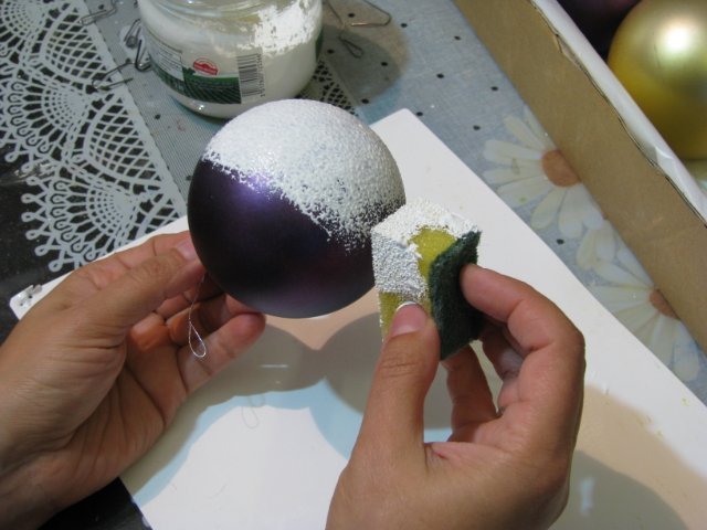 Одна из самых легких техник декорирования. Готовый шар с точечной росписью получается оригинальным и очень красивым. Интересная текстура образовывается благодаря маленьким точечкам, сливающимся в один рисунок.