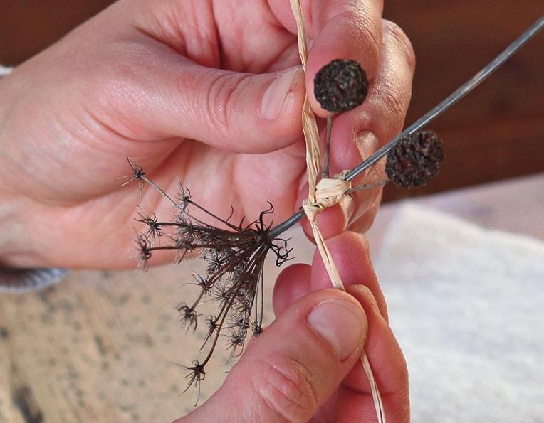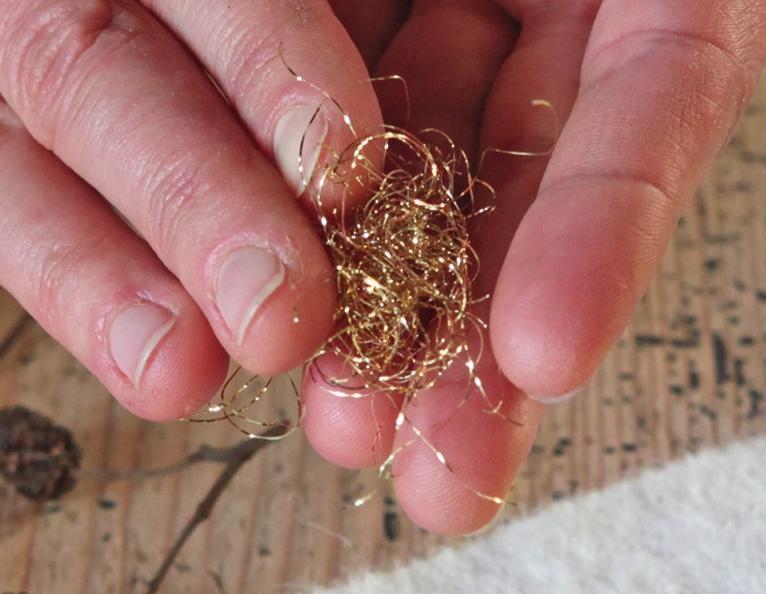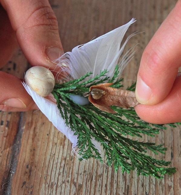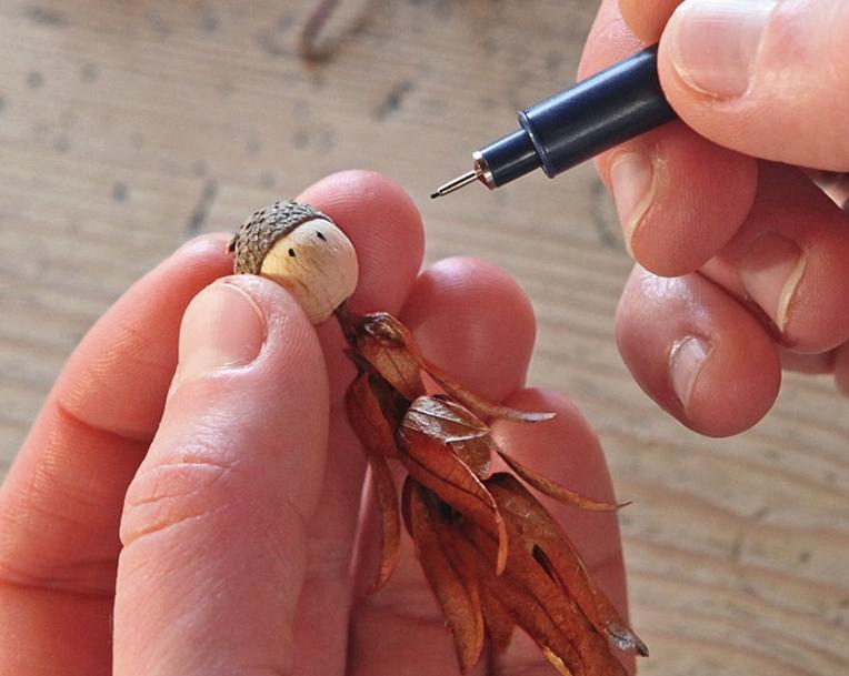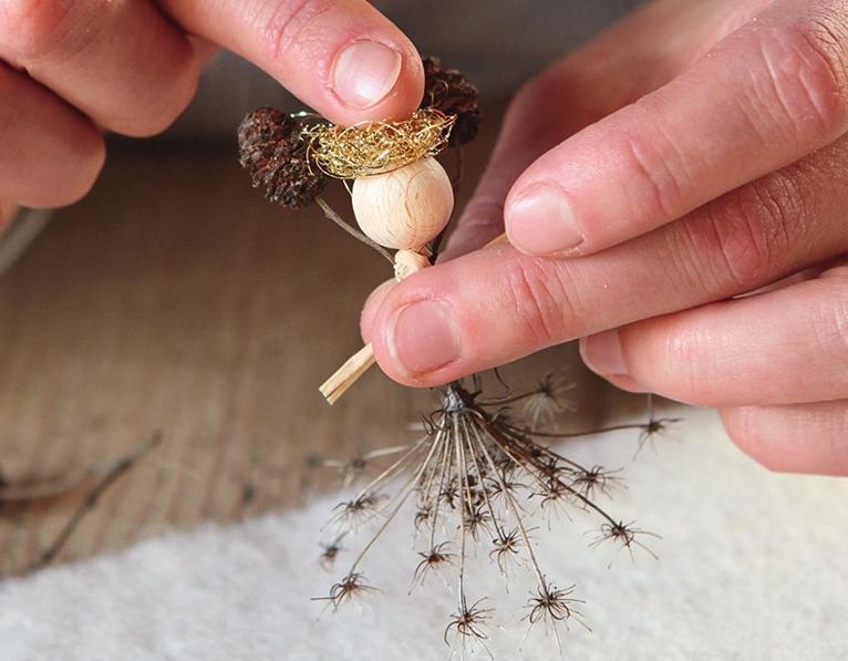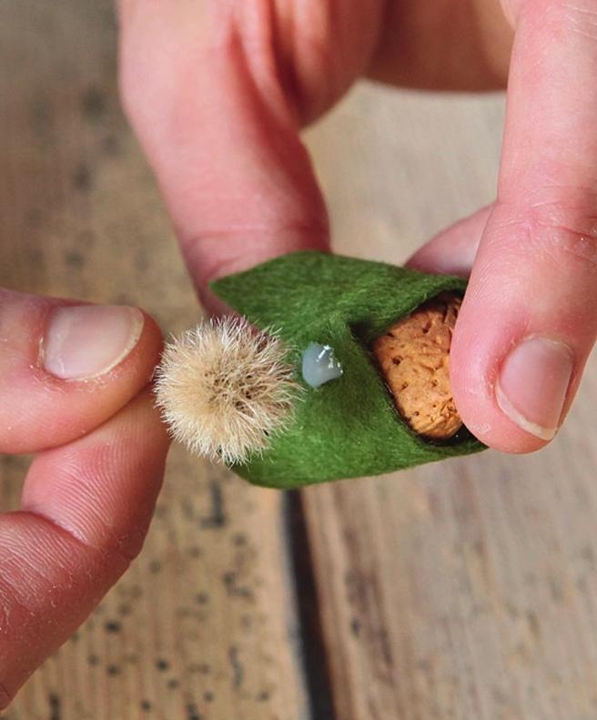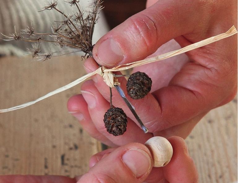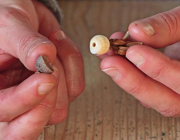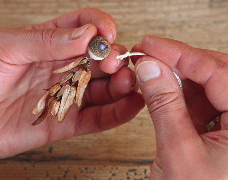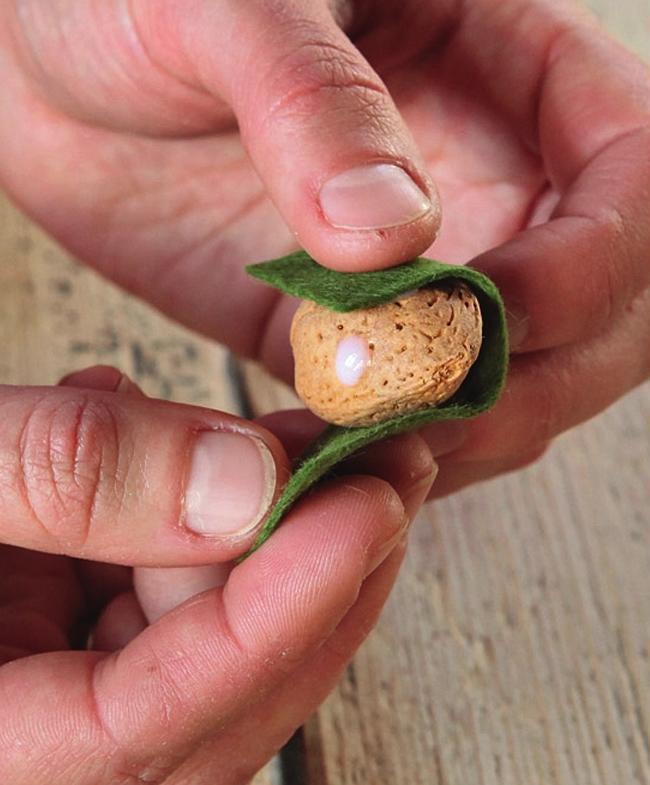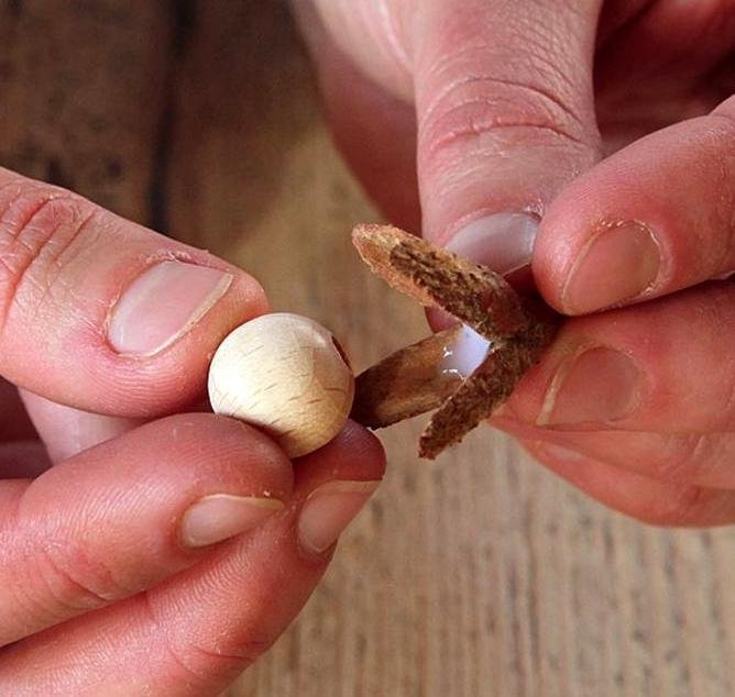 Подготовленное ядро красим в коричневый цвет и приклеиваем шляпки хвостиками к шару. Заполнять пространство необходимо как можно плотнее. Место одного впалого элемента займет крючок крепление из проволоки. Декорировать игрушку можно при помощи силикатного клея и блесток, красивых бусин внутри шляпок, ленточек.
