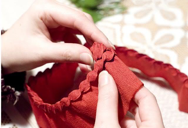 Подготовленные тканевые прямоугольники необходимо ровно приложить к долькам и спрятать их края в пазы. Проталкивать материал можно любым плоским предметом. После оформления всех секторов можно переходить к декорированию. Швы прячем под лентой или тесьмой, обматывая материалом шарик по диагонали. Из остатков шнура формируем петельку.