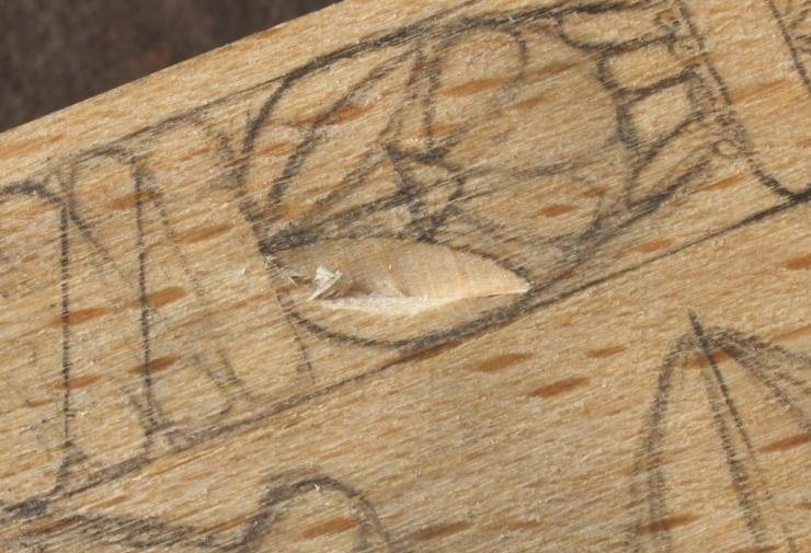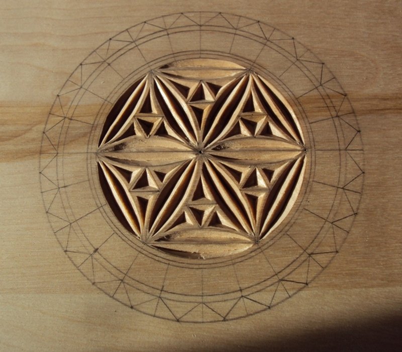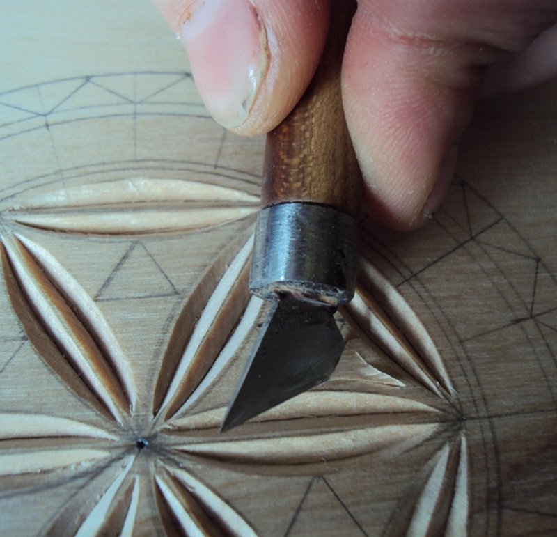 Теперь в дело вступает нож-косячок для работы над треугольными элементами. Этот инструмент держат иначе. Его зажимают между указательным и большим пальцами, словно карандаш, но у самого конца ручки, ближе к лезвию. «Пятку» ножа с силой вгоняют в заготовку под углом в 45 градусов, но не у самого края фигуры, а с небольшим отступом. Его необходимо сделать, чтобы у выемки были «пологие» края. «Канавки» с таким рельефом выглядят красивее. Грани треугольников должны сходиться. По такому же алгоритму вырезают оставшиеся элементы рисунка. Отработанные кусочки древесины должны иметь форму пирамидок, тогда работа выполняется правильно.