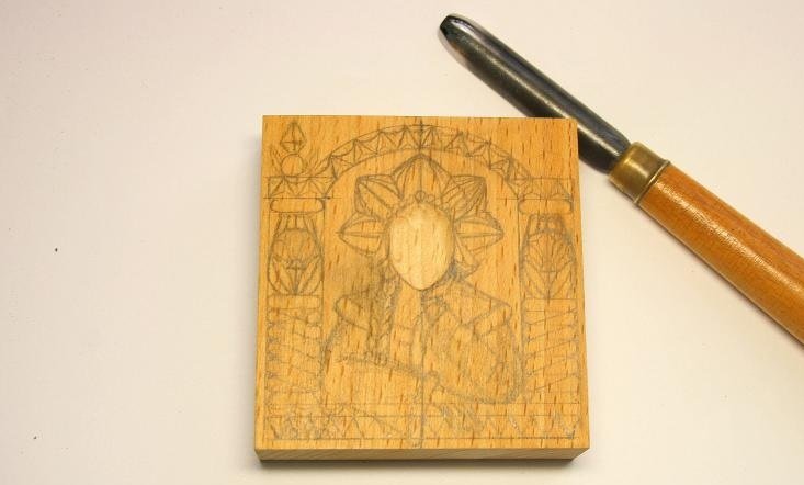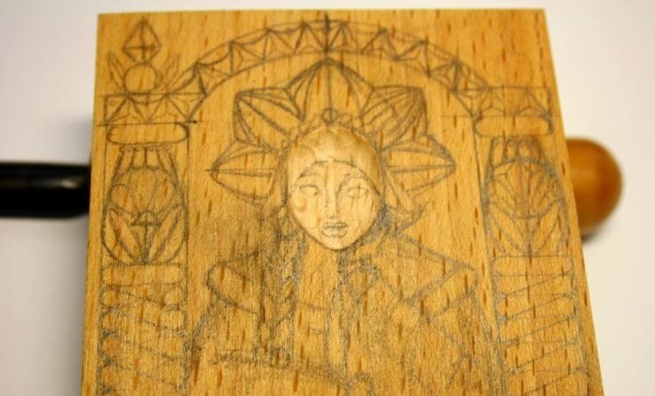 Начинать нужно с мягких деталей (круги, лепестки, плавные линии). Для работы используют нож-перо. Его зажимают в руке между ладонью и указательным пальцем. Большой палец отставляют в сторону и прислоняют к заготовке. Он послужит опорой. Согнутый указательный палец станет регулятором силы нажима на инструмент и угла его наклона. От этого будет зависеть глубина «канавки». Помните, что резать нужно «от себя». Сначала обрабатывают одну часть композиции (слева или справа зависит от ведущей руки), а затем болванку переворачивают и продолжают вырезать вторую часть узора.