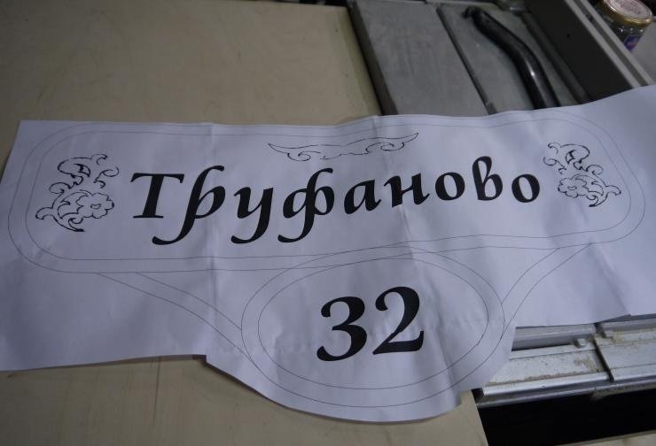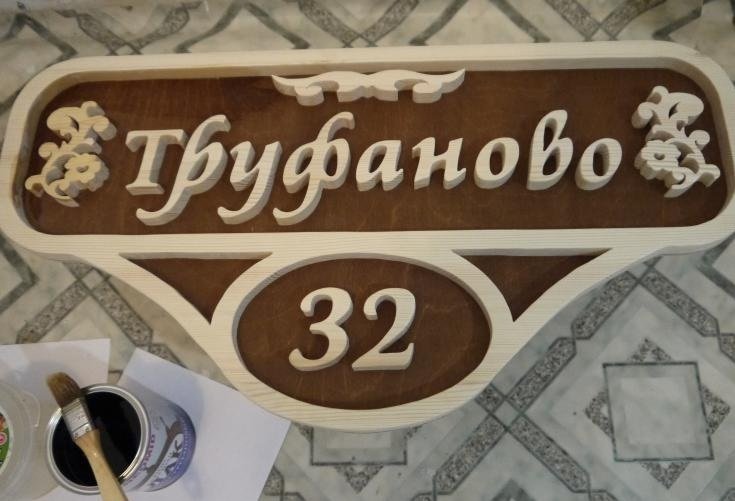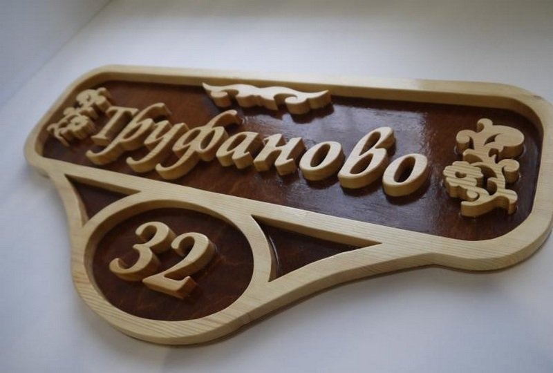 Таблички, как правило, имеют неправильную форму. Контуры изделия подчеркивают изгибы букв, поэтому с заготовкой придется повозиться, выпиливая лишние фрагменты в определенных местах. Буквы можно нарисовать от руки с использованием карандаша и линейки, или скачать уже готовую надпись с интернета. Изготавливать таблички очень просто, поэтому вариант идеален для начинающих резчиков. Для работы достаточно ножа-косячка и богородского набора «Татьянка». После вырезания табличку шлифуют и покрывают морилкой. Когда состав высохнет, углубления дополнительно подчеркивают вторым слоем. Надписи на табличках для бани дополняют облаками, дубовыми или березовыми листиками, ковшами, тазиками с вениками. Для улицы используют красивый, ровный шрифт и аккуратные завитушки по контуру, так как здесь рисунки будут неуместны. Таким же способом можно изготовить оригинальную вывеску для торговой лавки или пивной, к примеру.