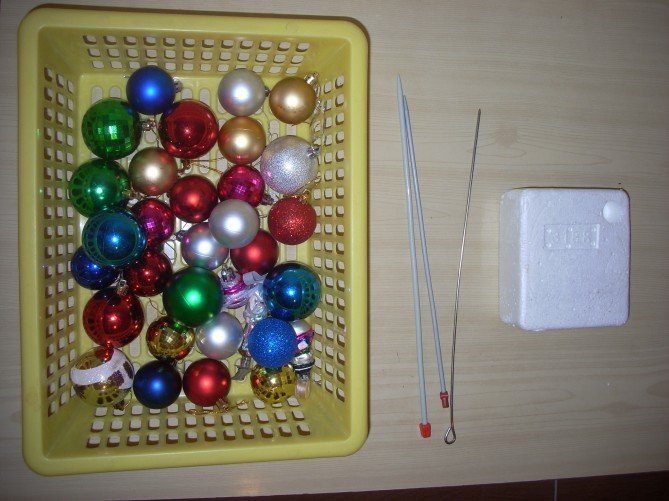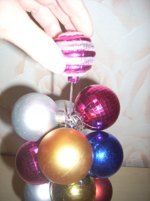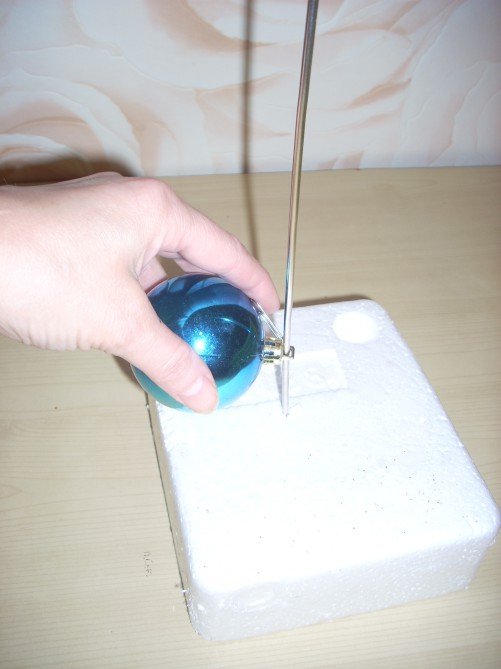 Начинать работу следует с изготовления основания. Мы будем использовать шарик из пенопласта. Так как елочные украшения могут иметь разные формы и пригнать их друг к другу плотно не получится, необходимо задрапировать основание. Для этого используют мишуру, дождик, фольгу или обрезки блестящей ткани, бумаги для поделок. Закрепить материал можно с помощью клея. Для дождика подойдет обычный скотч. Излишки материала обрезают, чтобы основа выглядела аккуратно. Из многообразия елочных украшений лучше выбирать самые дешевые из пластика. Во-первых, стеклянные шарики имеют большой вес, а дополнительные нагрузки для ствола топиария нежелательны. Во-вторых, украшения нужно подрезать, чтобы разнокалиберные игрушки не выделялись на общем фоне. Чтобы разрезать пластик, потребуются только ножницы. У небольших шариков достаточно удалить только «хвостик», к которому крепится крышечка с ленточкой для подвешивания. После того как украшения подготовлены, их закрепляют на основе с помощью клея.