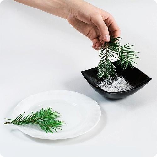 Сам горшочек смазывают клеем и присыпают серебристым глиттером. Пиафлор под стволом можно присыпать спиральками из мандариновой кожуры, об изготовлении которых уже говорилось выше. Чтобы основание деревца не смотрелось слишком оголенным, в него «сажают» еще пару сосновых веточек. Если флористическую губку смочить, то они простоят достаточно долго.