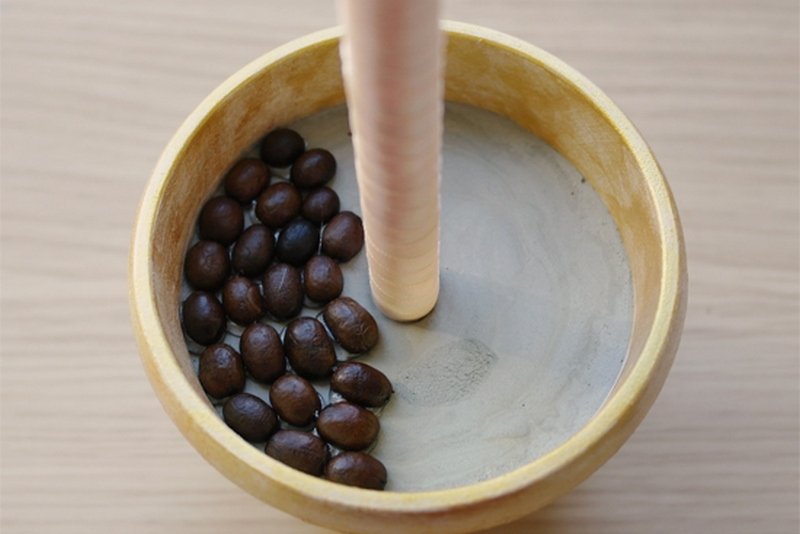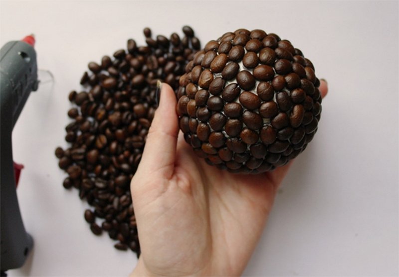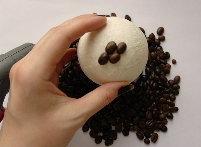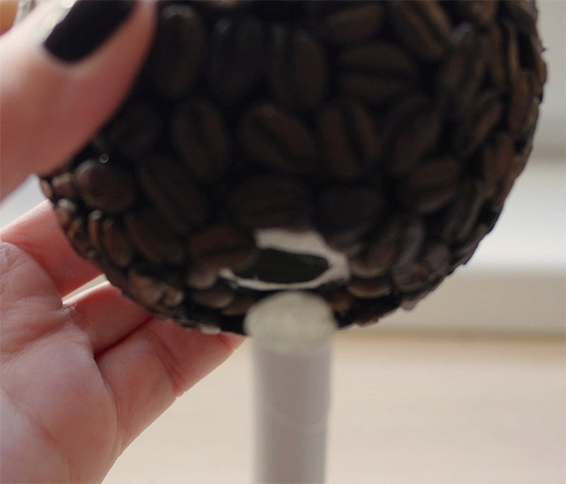 Для топиария из кофейных зерен берут пенопластовую основу, идеальной круглой формы. Декор на ней закрепляют с помощью клея. Самая простая композиция выполняется из зерен естественного коричневого цвета. Для более сложных вариантов зернышки предварительно сортируют и каждую часть окрашивают в несколько оттенков или покрывают глиттером разных цветов. Из таких элементов можно собрать абстрактную крону или же потратить больше времени и выложить оригинальный узор.