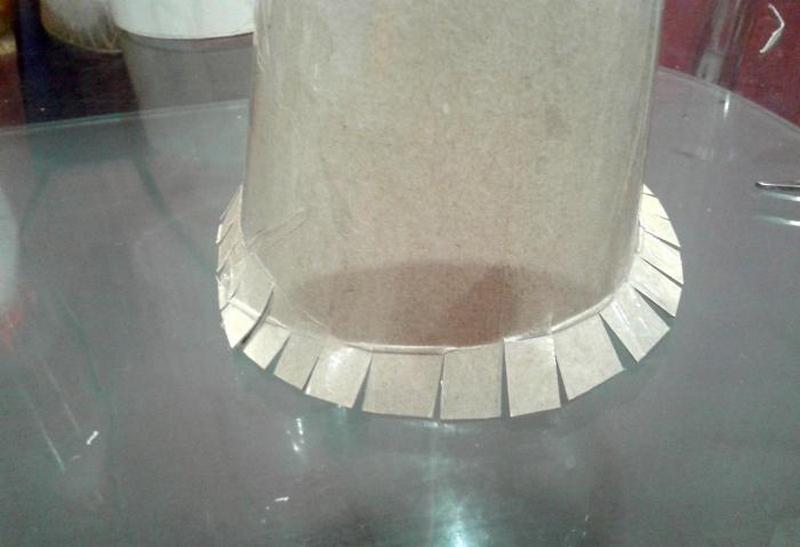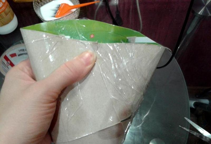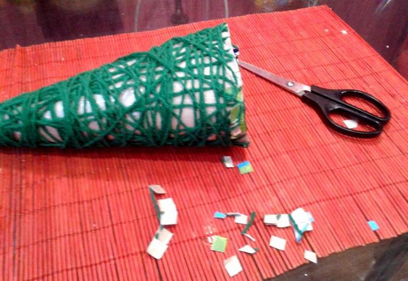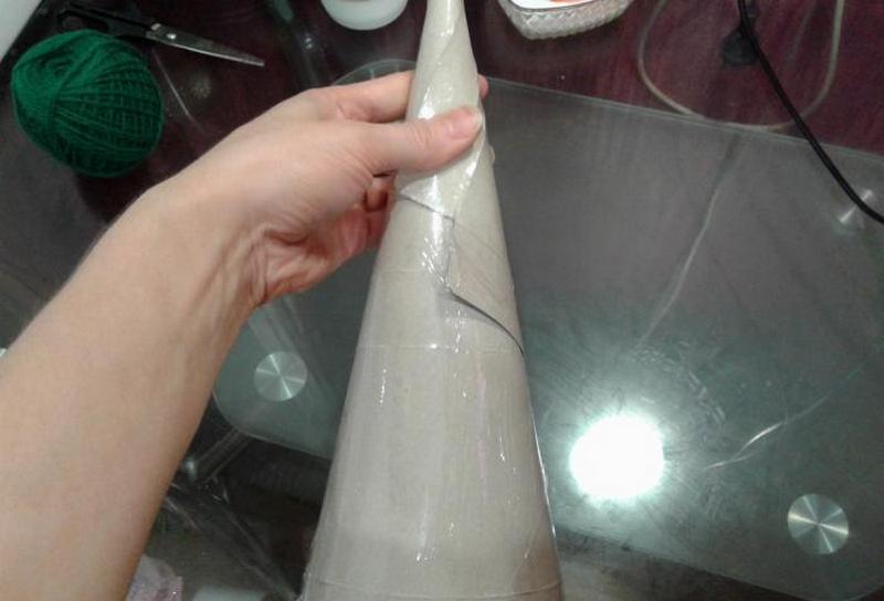 Основу в форме упрощенной елочки изготавливают из тех же материалов, что и для шарообразной кроны. Такую конфигурацию сделать сложнее, так как оригинальное деревце состоит из нескольких усеченных и одного полноценного конуса на верхушке, которые водружены друг на друга. Найти какой-либо предмет или емкость, совпадающий по форме, практически невозможно. Начинающим лучше прибегнуть к лаконичным идеям минимализма и использовать один конус, который и будет символизировать новогоднюю елку. Форму легко сделать из обычного картона, который впоследствии оборачивают слоями бумаги, смоченной в клеевом составе. Также для такой поделки подойдут праздничные колпаки, которые обычно надевают на головы гости именинника.