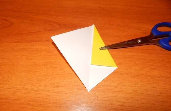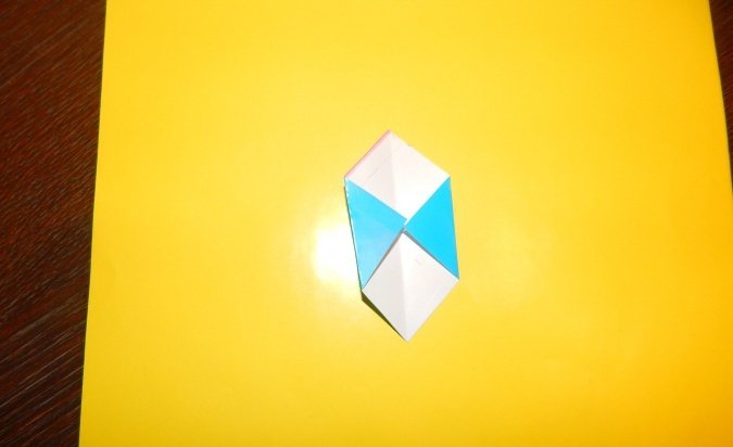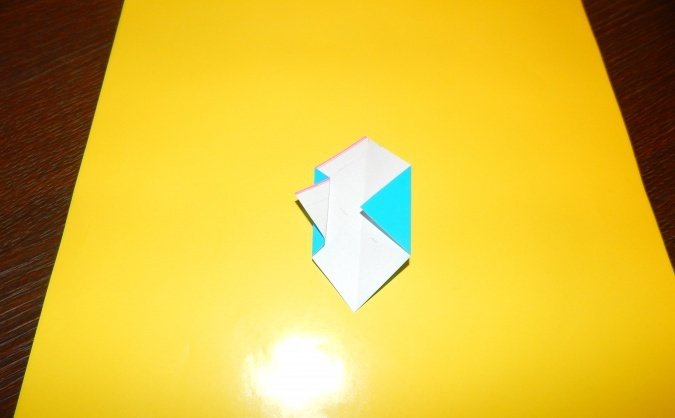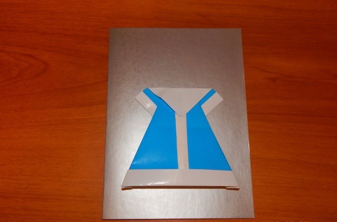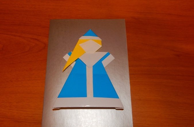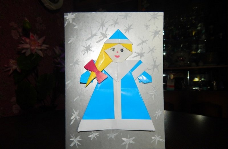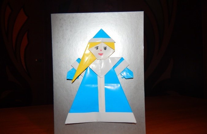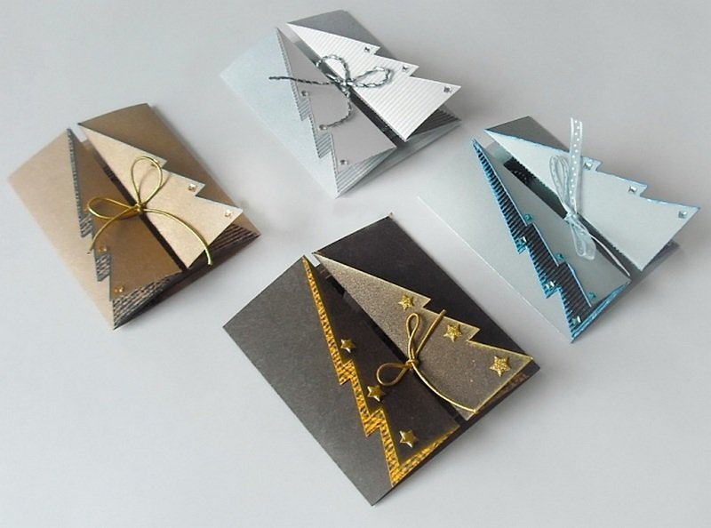 Сделать простую и оригинальную открытку к Новому году в технике оригами вы можете, используя наш следующий мастер-класс. Для работы рекомендуем использовать дизайнерскую бумагу с новогодними узорами. Сама работа поэтапно проводится по такой инструкции: