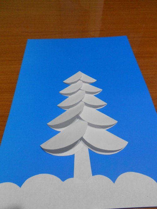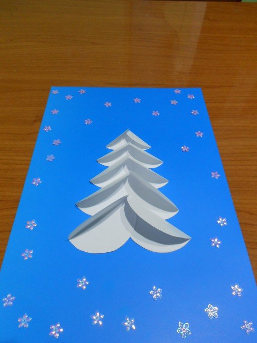 Сделать пошагово прикольную открытку с объемной елочкой – проще простого. Для работы потребуется картон (2 листа), карандаш, клей ПВА, ножницы, 2-3 вида зеленой бумаги. Легко и просто изготовить такую поделку можно по следующему мастер-классу: