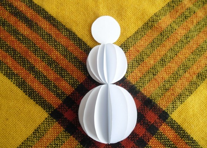 Из обычной бумаги можно сделать не только объемные елочки, но и другие тематические новогодние фигурки. Например, используя голубой, желтый и черный картон, белую бумагу, можно сделать своими руками такую открытку с объемным снеговиком:
