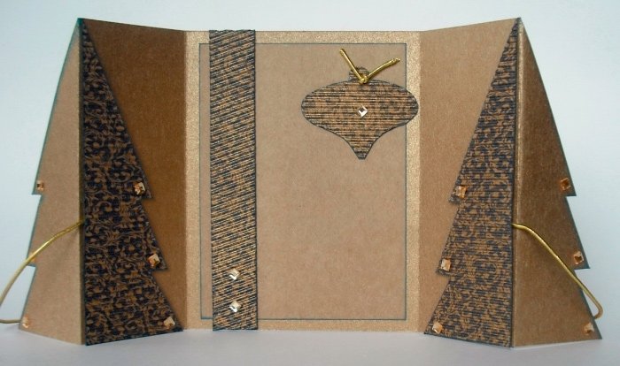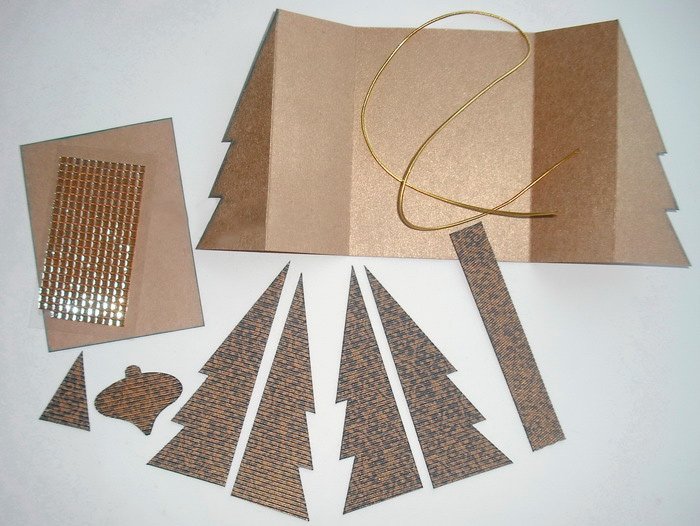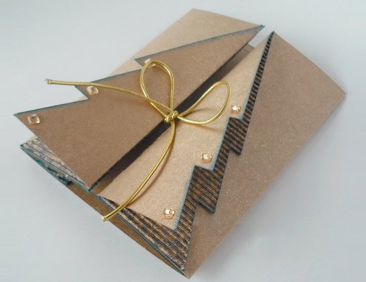 Из картона вырезается пирамида. В нижней части приклеивается край зеленой вязальной нити. Этой нитью обматывается вся пирамида (периодически нитка фиксируется клеем, чтобы фигурка не размоталась). Готовый декор украшается стразами, приклеивается к поздравительной открытке.