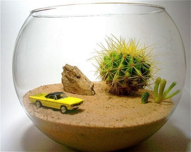 Композиция «пустыня» может состоять только из растений в песке или дополняться искусственными элементами. Хорошо смотрятся одиночные кактусы в большой вазе или аквариуме. Рядом с центральной фигурой размещают камни разного размера, имитирующие скалы, из палочек делают мини-костер. Для полного эффекта можно добавить пластиковые фигурки индейцев, игрушечную машинку и прочие тематические мелочи.