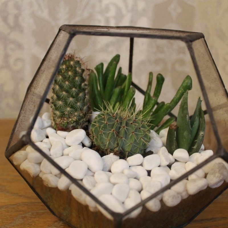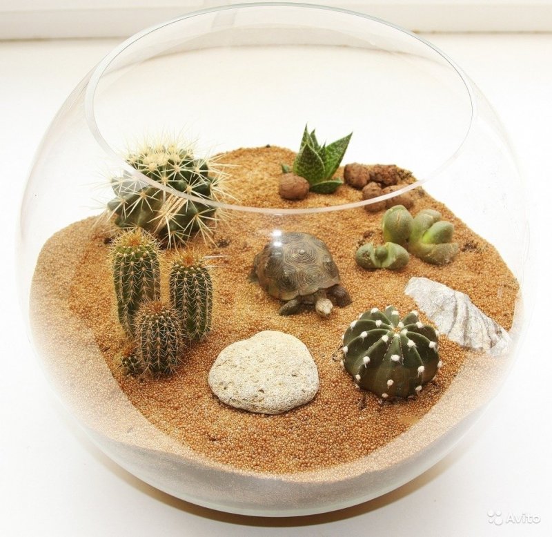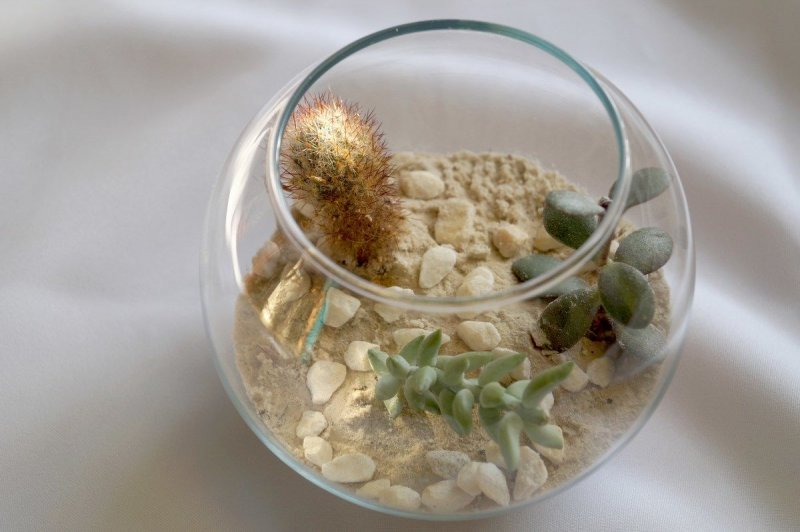 Неприхотливый флорариум подойдет тем, кто не имеет достаточно времени для ухода за растениями. Главным элементом композиции выступают суккуленты (агава, кактус, алоэ). Они способны накапливать влагу, идеально подходят для засушливой местности. Миниатюрные кустики приживутся в любой закрытой или открытой емкости. Для грунта используют землю, песок, задекорированные керамической крошкой, маленькими камушками.