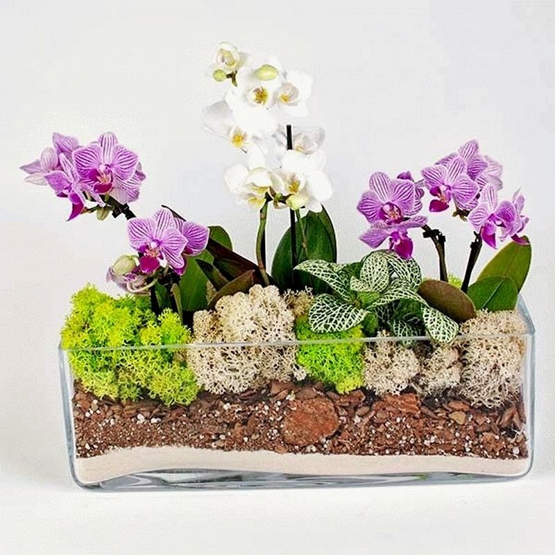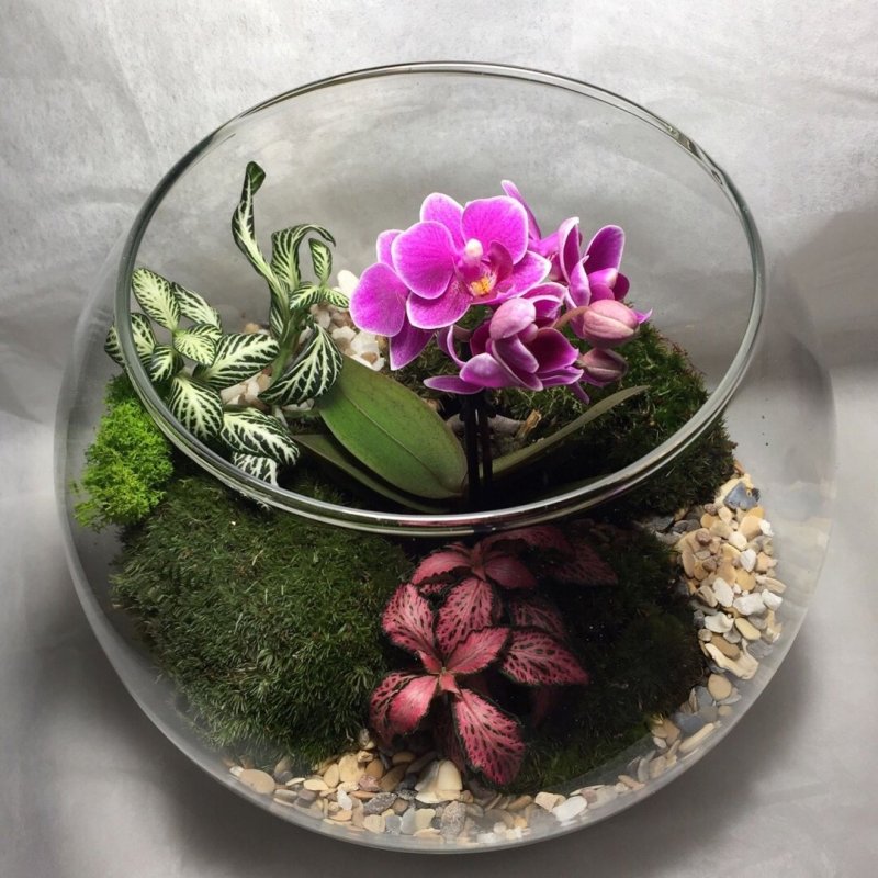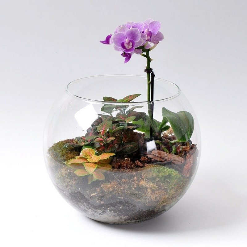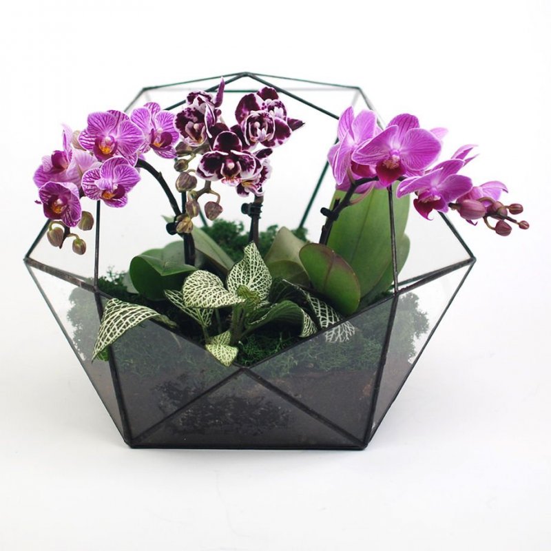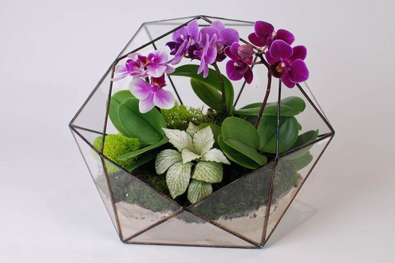 Полузакрытые флорариумы – идеальное место для выращивания капризных орхидей. Такие конструкции обеспечивают постоянную влажность и максимально приближенные условия к естественным тропикам. Их размер может быть любым – отлично будет смотреться как прямоугольный стеклянный короб, так и вытянутая миниатюрная ваза.