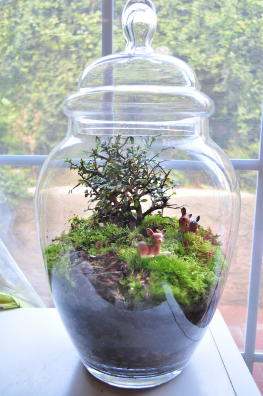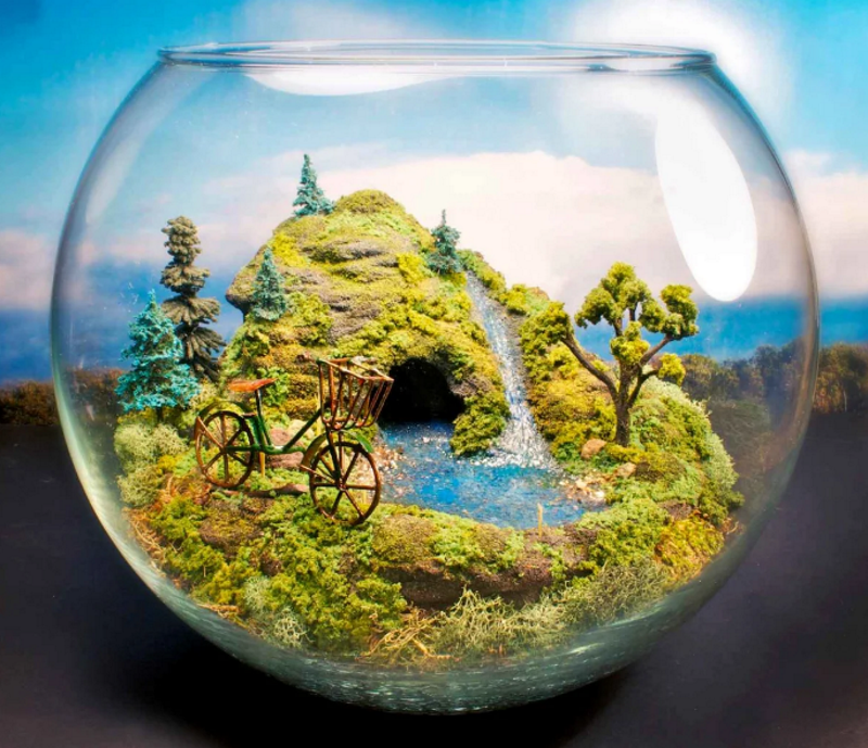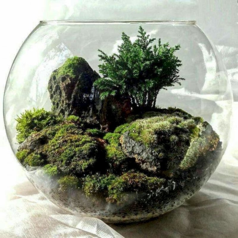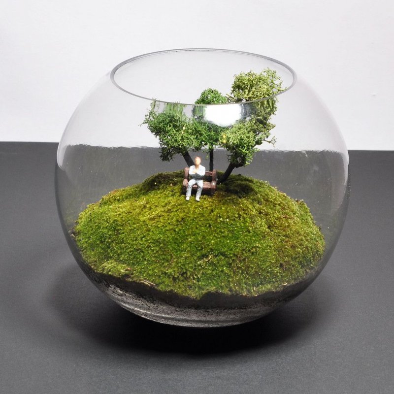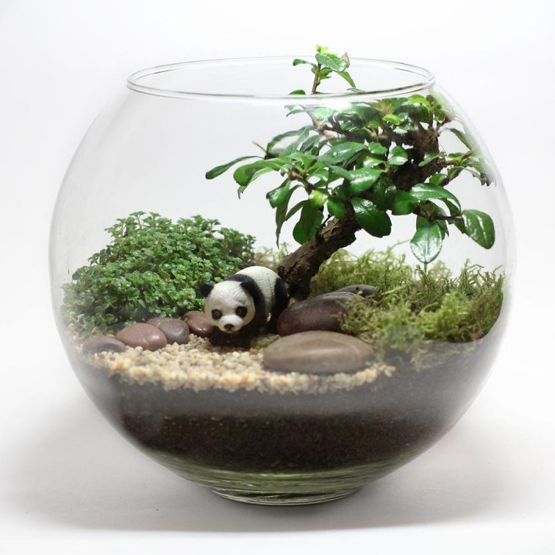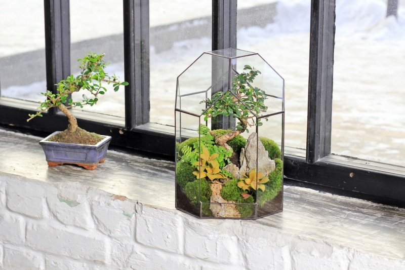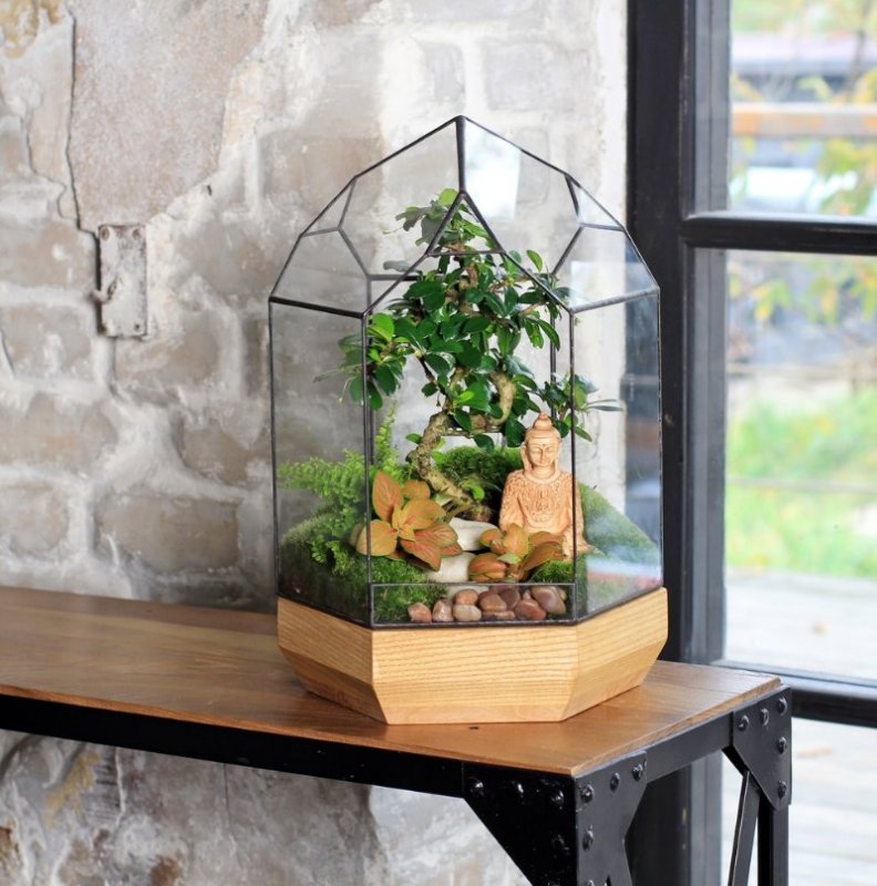 Гармоничная восточная поделка за стеклом с деревцом бонсай наполнит комнату уютом и спокойствием. Уменьшенная копия природного элемента дополняется камнями, мхом, зеленью, древесными щепками и тематическими пластиковыми фигурками. Создать композицию можно, используя различные стили и типы растений. В миниатюрном варианте будут отлично смотреться: