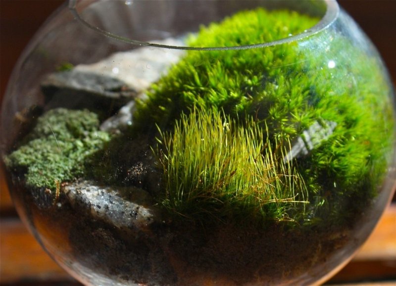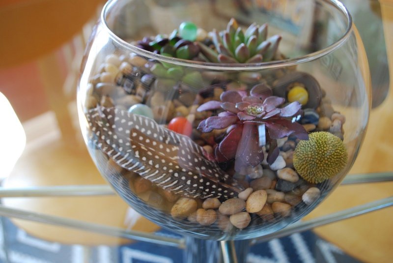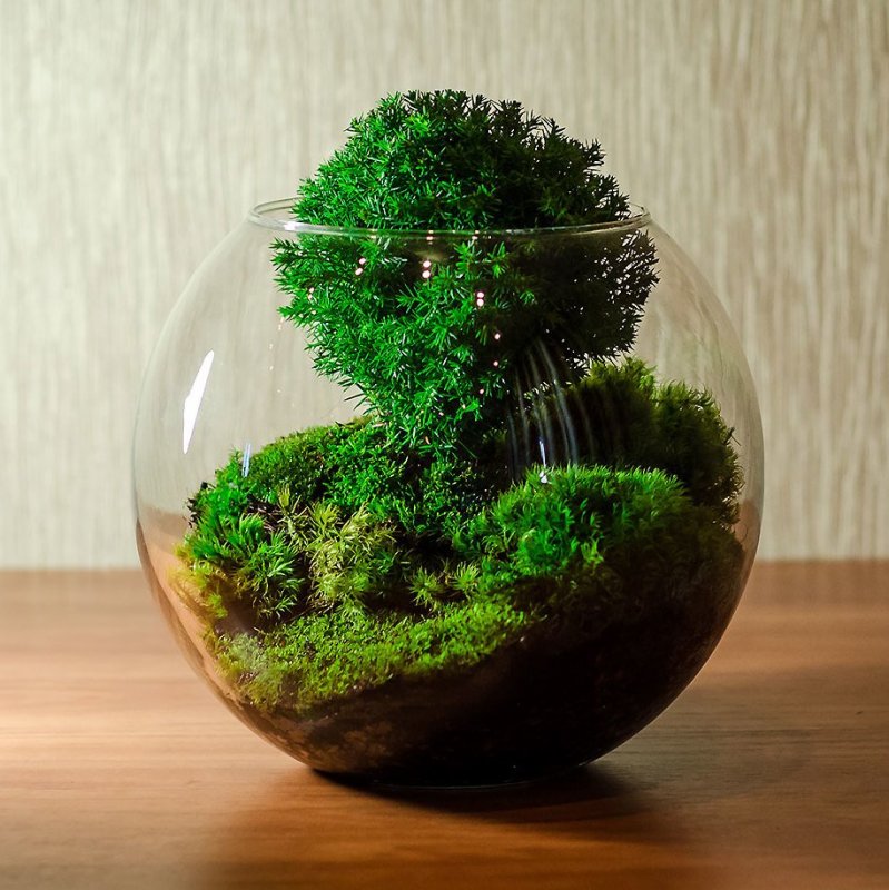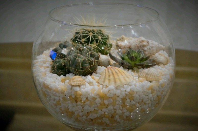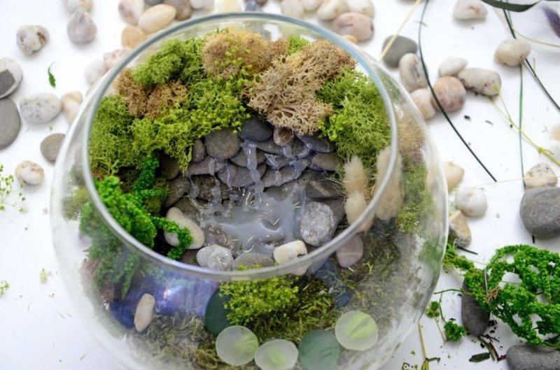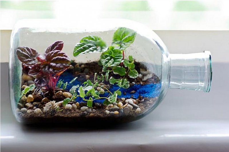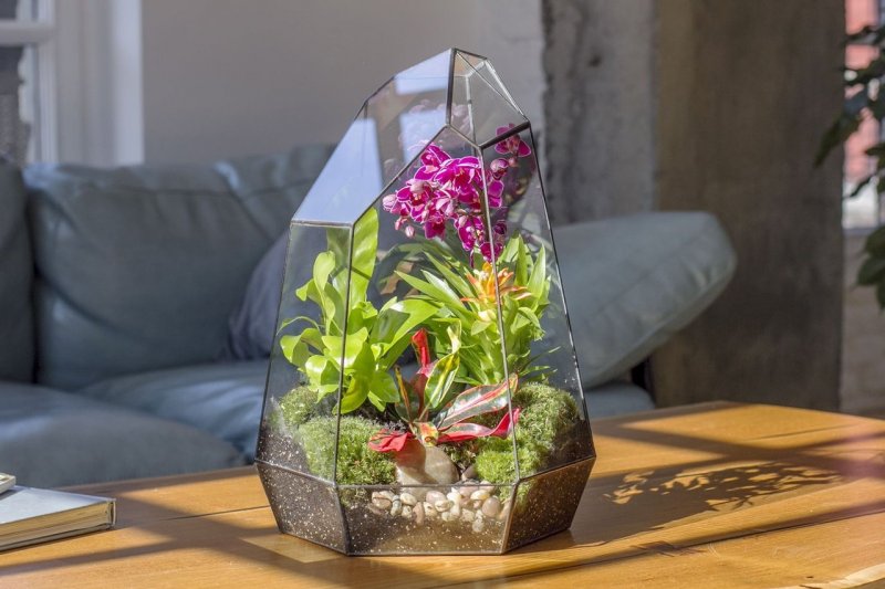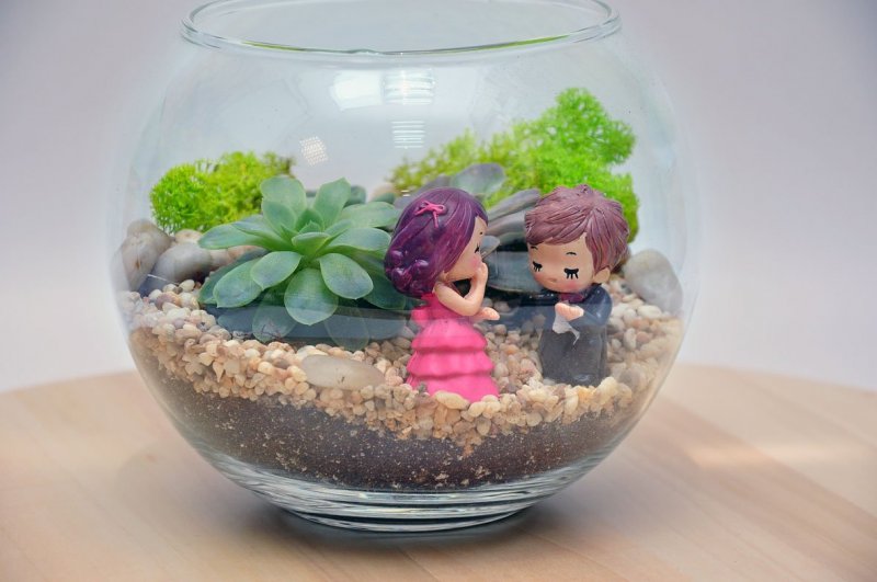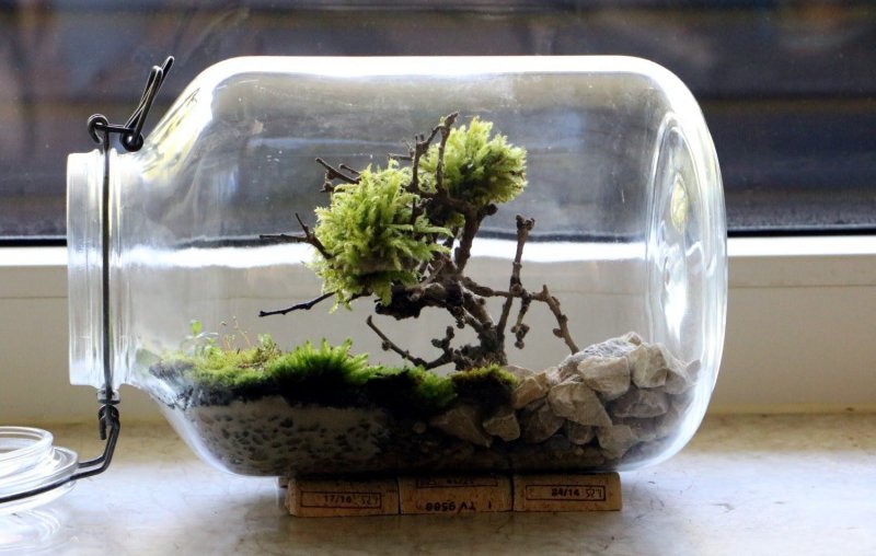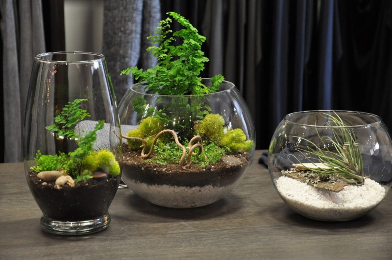 Композиции из растений в прозрачных емкостях обитают в закрытой среде. В таких стенах проходят всевозможные естественные процессы: фотосинтез, цикл роста, питание жидкостью. Для создания натурального аксессуара можно использовать любой стеклянный предмет – аквариум, графин, банку.