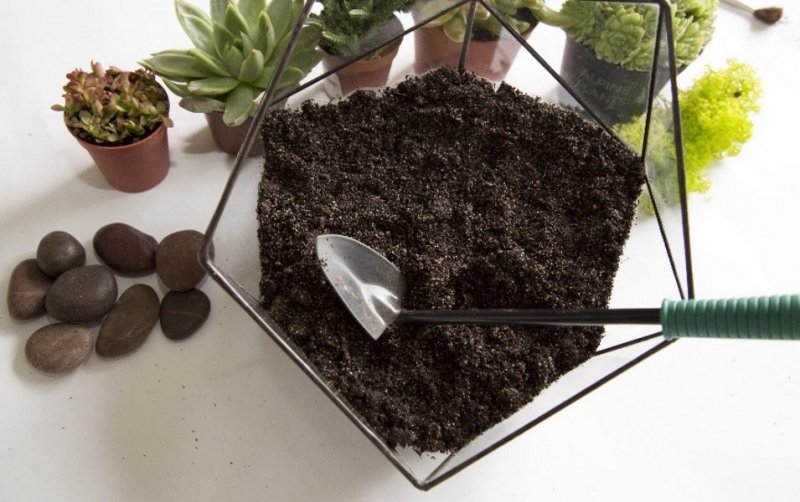 Поскольку дренажные отверстия во флорариуме отсутствуют, искусственные разрыхлители грунта просто необходимы. На дно емкости выкладывают камешки, накрывают их мхом или кусочком мешковины и застилают слоем древесного угля. Для нетребовательных растений земля может быть взята из огорода или леса. Ее следует обязательно продезинфицировать, поскольку влажная среда благоприятна для развития плесени и грибков.