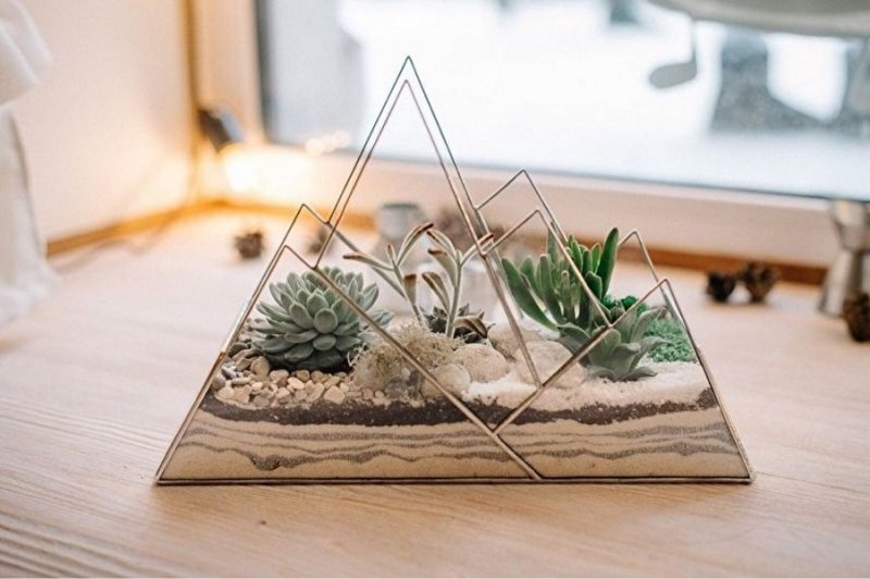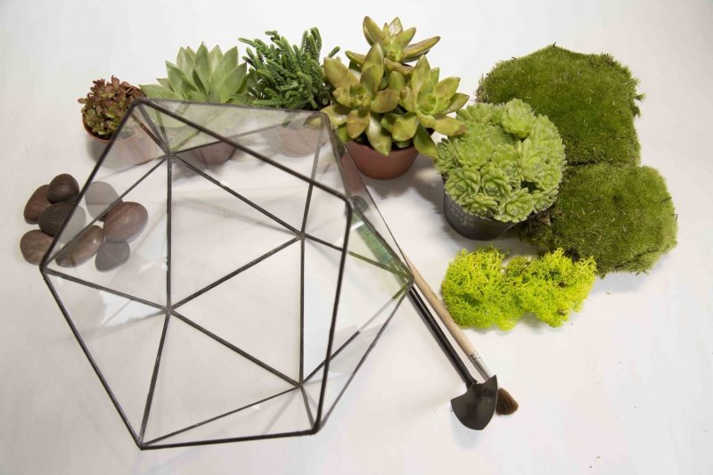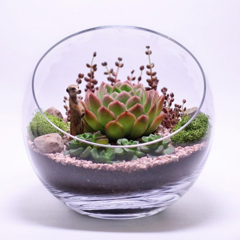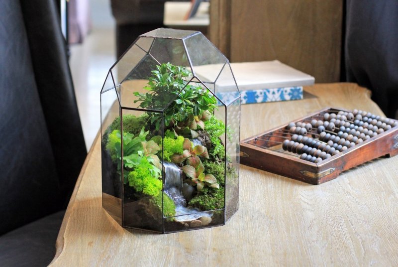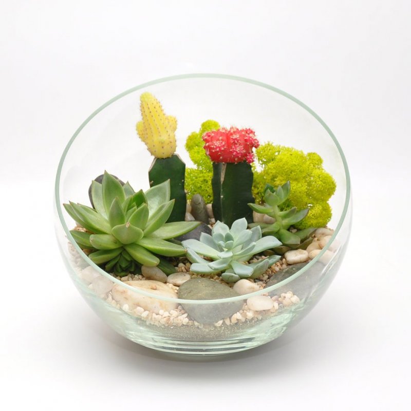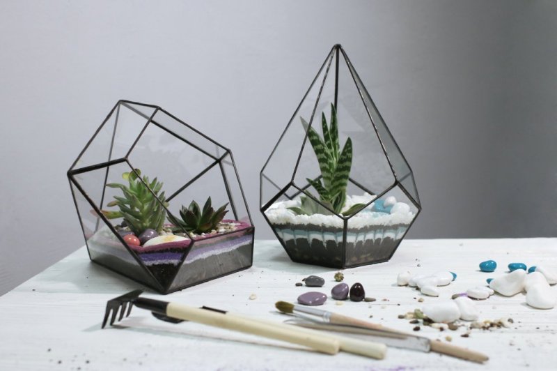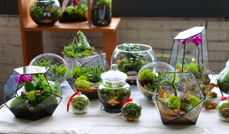 Создают живые аксессуары из самых необычных стеклянных предметов. Они отличаются геометрической формой, размером, декоративными элементами. В зависимости от типа емкости получатся следующие натуральные оранжереи: