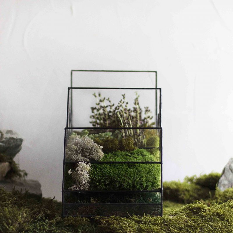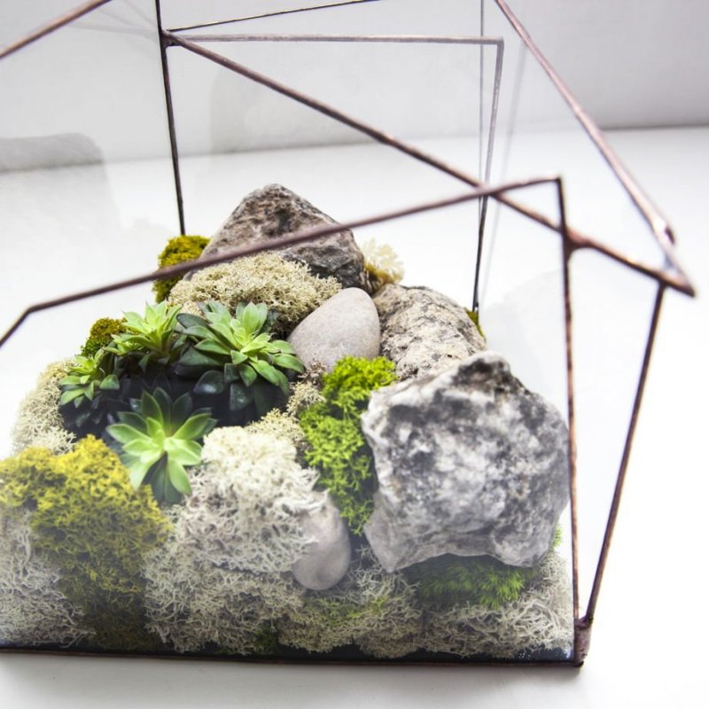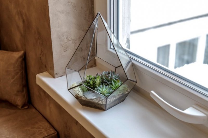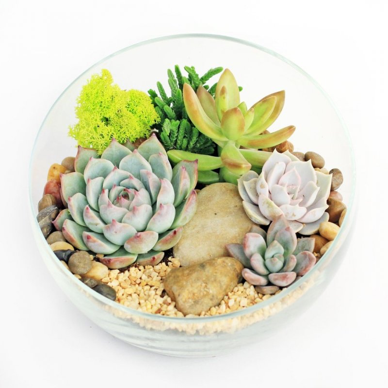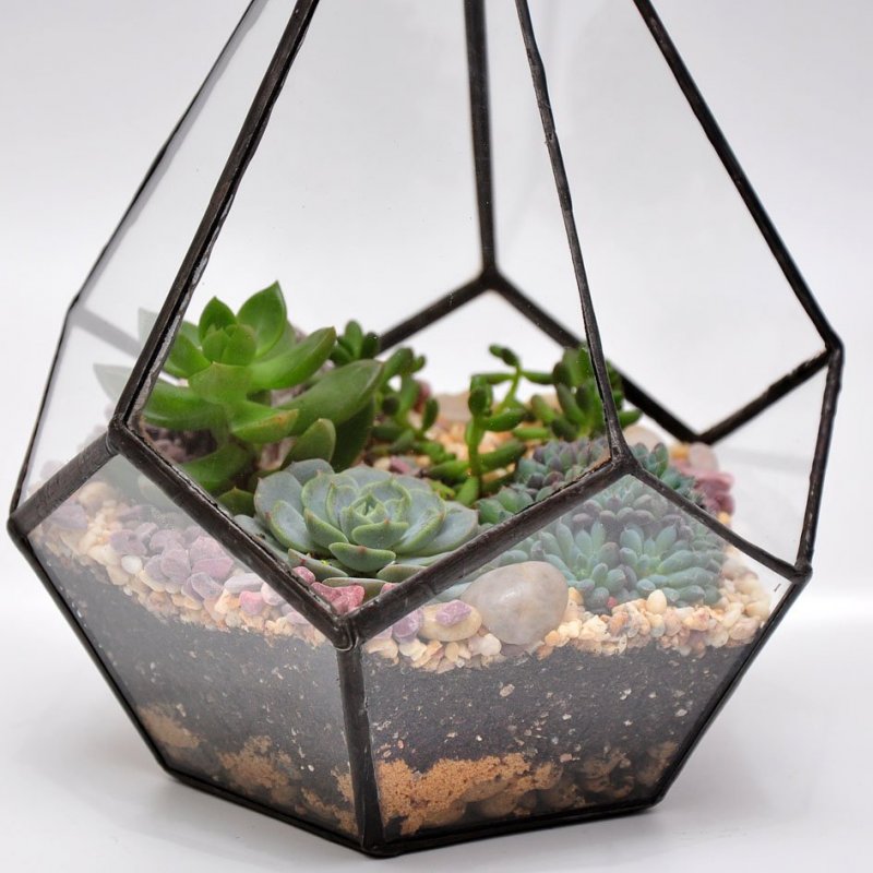 Создают живые аксессуары из самых необычных стеклянных предметов. Они отличаются геометрической формой, размером, декоративными элементами. В зависимости от типа емкости получатся следующие натуральные оранжереи: