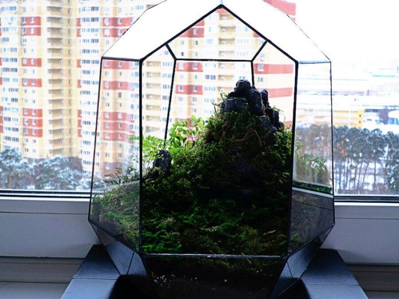 Поскольку вся зелень высаживается в одну почву, необходимо чтобы она имела одинаковые к ней требования, потребность увлажнения. Грунт должен быть сложного состава, включать песок, листовую землю, торф. Для поддержания постоянной влажности за стекло можно поставить стаканчик с водой, задекорировав под водоем. Если оранжерея открытого типа, растения следует ежедневно опрыскивать из пульверизатора.