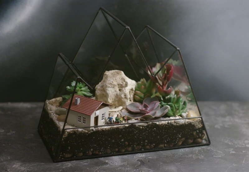 Если горы в аквариуме должны утопать в зелени, почву следует делать жирной, насыщенной органикой и хорошо дренированной. Для пустынных композиций надо подготовить гальку. В центре вазы располагают камни с острыми краями, сколами, неправильной формы. Растения для флорариума «горы» не требуют особого ухода. Достаточно поддерживать нужную температуру, добавлять влаги по мере ее испарения. Для большего эстетического эффекта надо использовать зауженные емкости (прямоугольные аквариумы, короба).