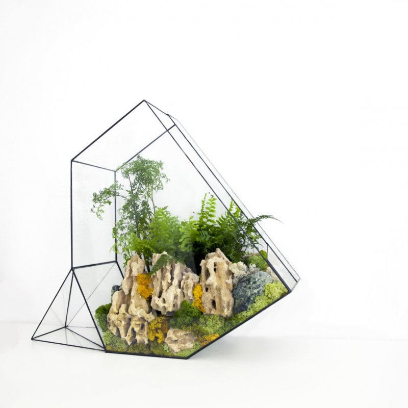 Основа композиции – высокогорный пейзаж. Растения для такого флорариума можно условно разделить на два типа: обитатели лесного подгорья и зелень скалистых полупустынных плато. Для сухих областей характерны растения полупустынь, для поросших лесом – влаголюбивые. Чаще композиции составляют из геснериевых и вьющихся типов.