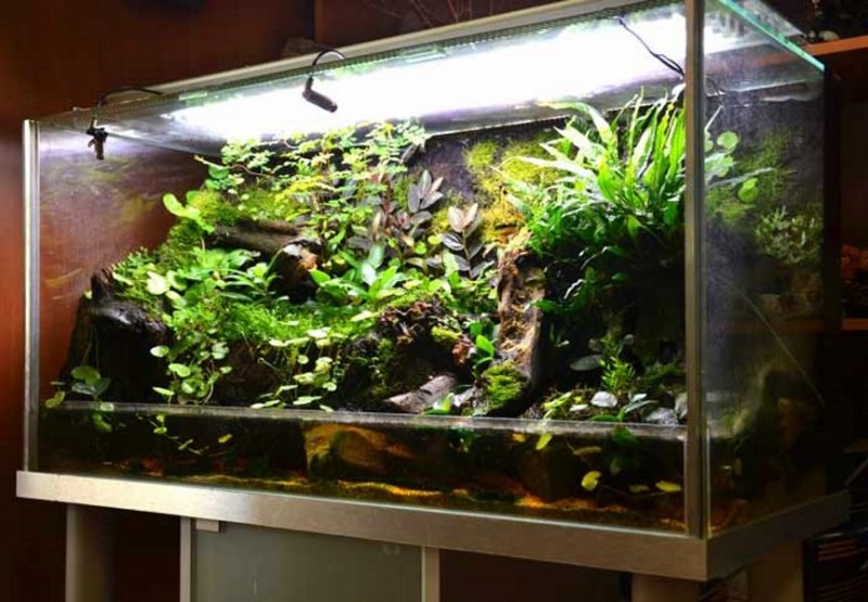 Емкость для водного сада должна быть герметичной. Заполнять ее можно любыми растениями, которые обычно используют для аквариумов или мини-садов. Подойдут криптокорины, лагенандры, анубиасы. Наземную часть композиции оформляют классическими для такой конструкции культурами – циссусами, тилландсиями. Если верхний участок подразумевает наличие горшков, можно использовать любые влаголюбивые растения. Заднюю стенку аквариума можно декорировать эпифатами, камешками, ракушками.
