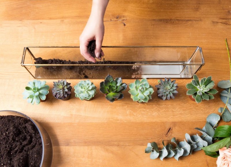 В первую очередь готовим основу для высадки. Тщательно моем и дезинфицируем емкость. После полного высыхания стекла укладываем дно дренажем. Чтоб корни растений не гнили, поверх камешков надо поместить древесный уголь. Переходим к подготовке почвы – смешиваем торф с песком и укладываем толстым слоем. Он должен составлять минимум 6 сантиметров. Разравниваем поверхность лопаткой и делаем углубления. Растения будут выглядеть максимально естественно, если высадить их на разном расстоянии друг от друга. После посадки поливаем композицию из лейки с рассекателем.