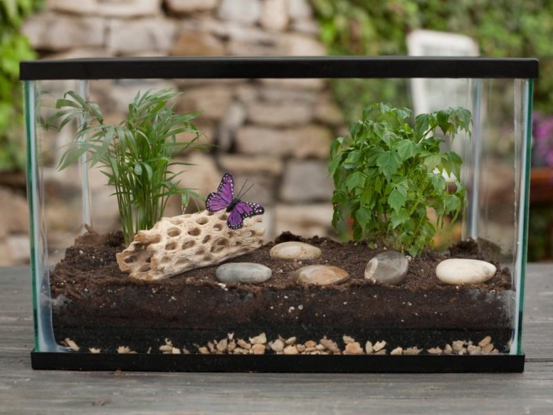 Ранее использованный аквариум – подходящая емкость для создания флорариума. В нем можно создать собственный зеленый уголок всего за пару часов. Придерживаясь определенной последовательности при укладке слоев и высадке растений, гарантированно получится оригинальная зеленая оранжерея. Ход работ мастер-класса заключается в следующем: