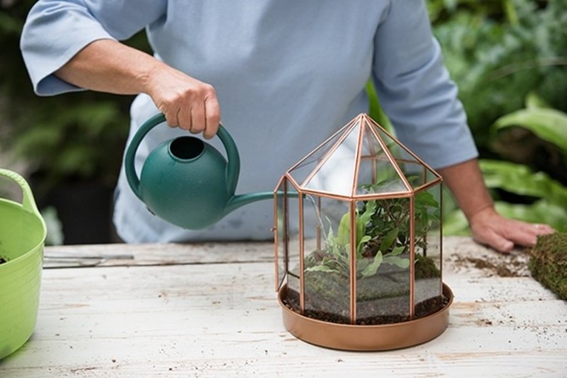 Миниатюрные сады напоминают теплицы из-за созданной внутри среды. Любое высаженное растение или целая композиция требуют определенного ухода. Также следует следить за чистотой самой емкости. Ее необходимо протирать влажной тряпкой с наружной стороны, стараясь не оставлять разводов, иначе они могут испортить всю картину. Уход за зелеными насаждениями заключается в следующем: