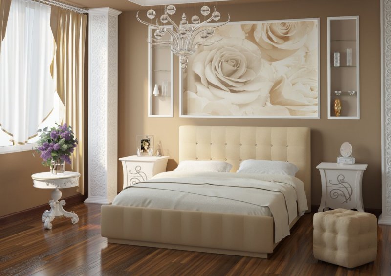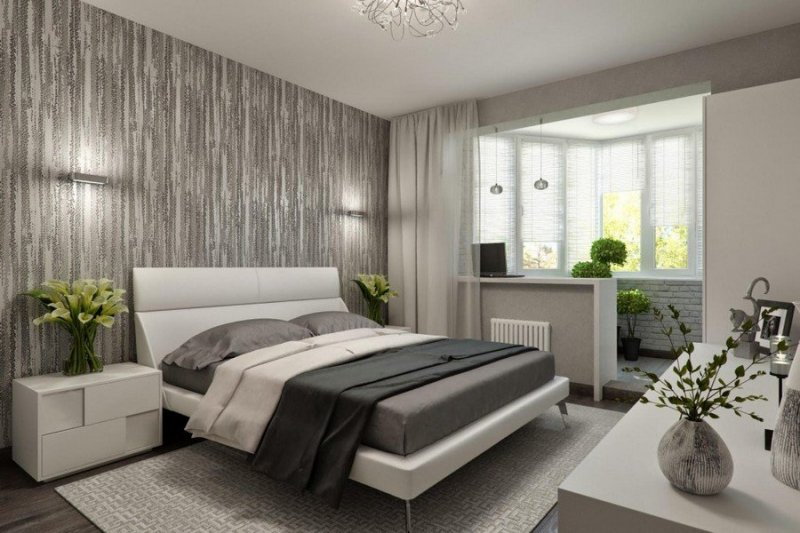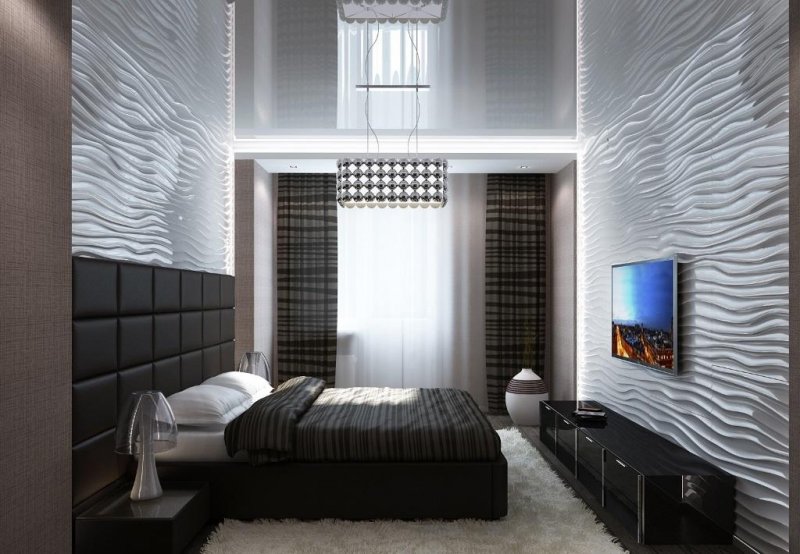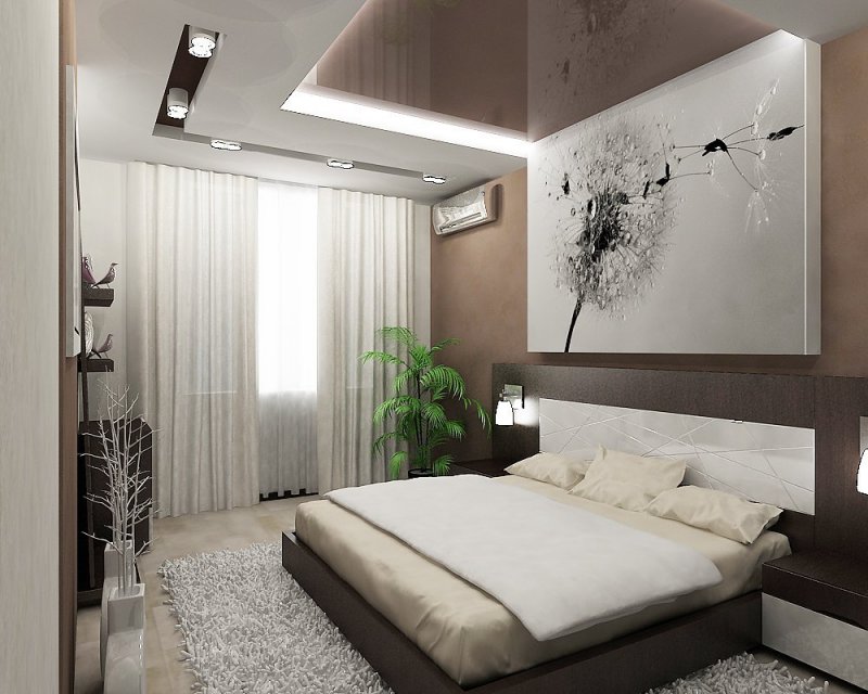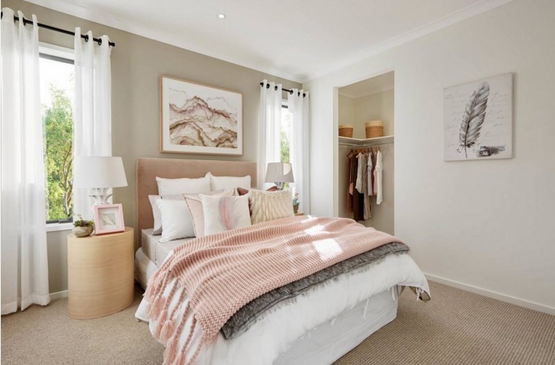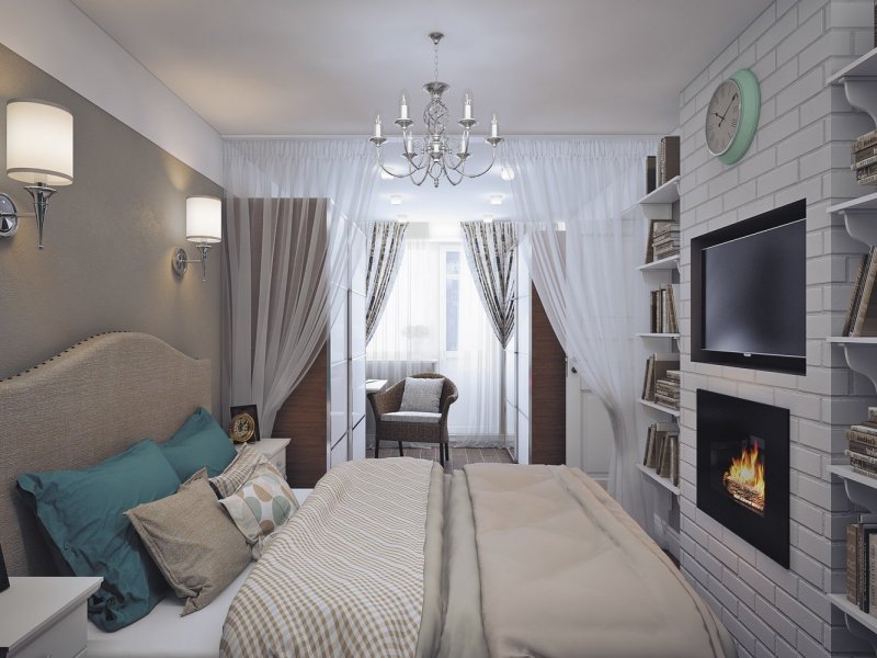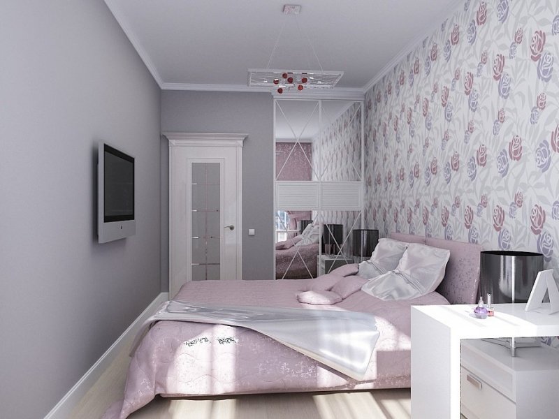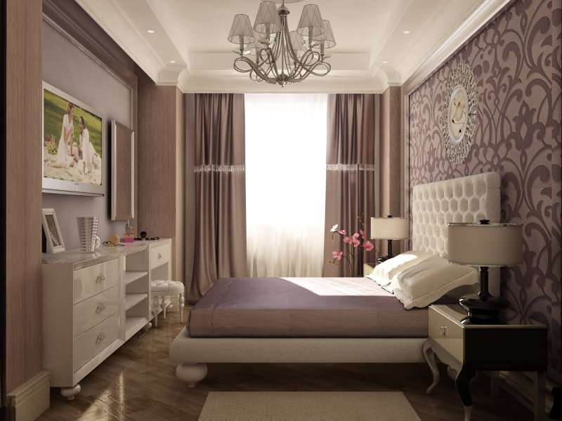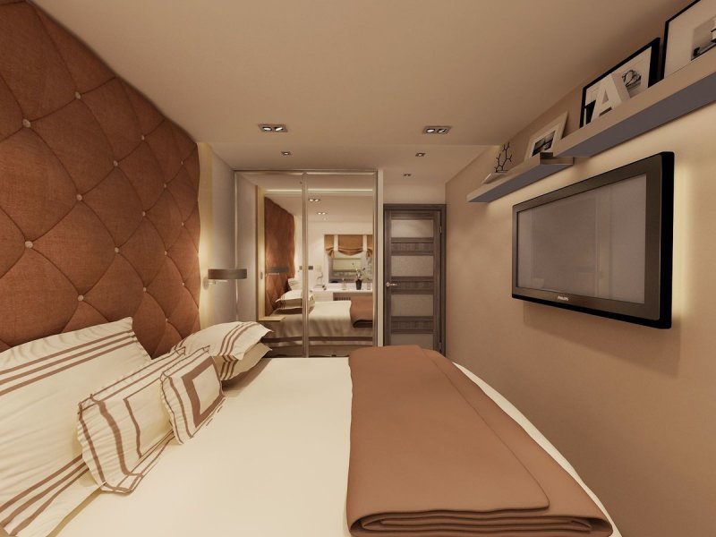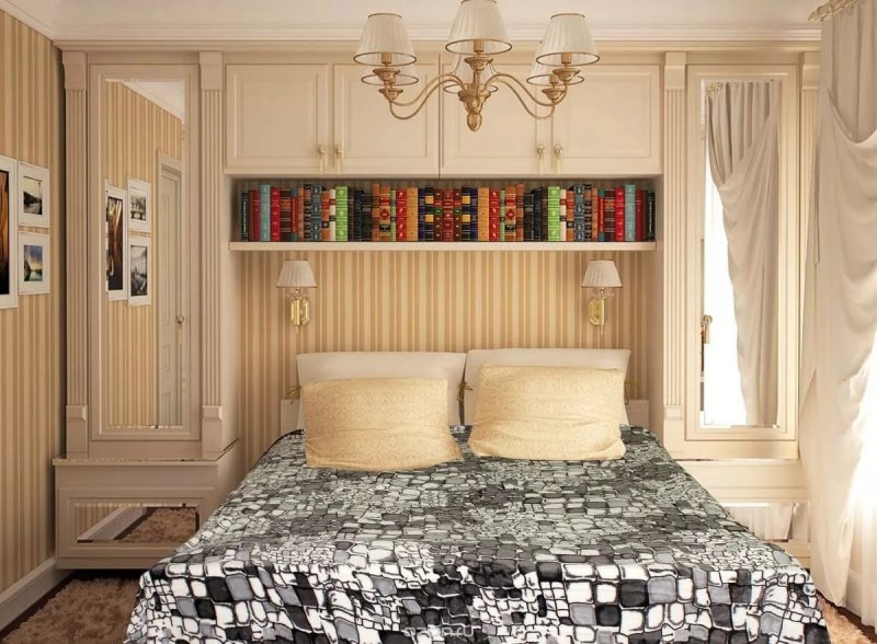 В комнате с шириной, ненамного превышающей длину кровати, разместить мебель можно только несколькими вариантами. Спальное место располагают боком к стене (если одна из них длиннее — то рядом с более длинной). С другой стороны будет более-менее свободный проход. В зависимости от общего размера помещения, один или два торца кровати оставляют свободными. Изножье, например, может вплотную примыкать к какой-то из стен или к окну. Но есть и альтернативный вариант, при котором изголовье приставлено к стене рядом с дверным проемом. Неудобств с обустройством односпальной кровати не будет, а вот с двуспальным местом связаны некие трудности, так как кому-то придется перелазить через лежачего или ложиться со стороны изножья. Если места на проходы нет вообще, то спальную мебель ставят в самом конце помещения, в большинстве случаев — возле окна, изножьем к дверному проему.