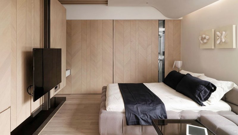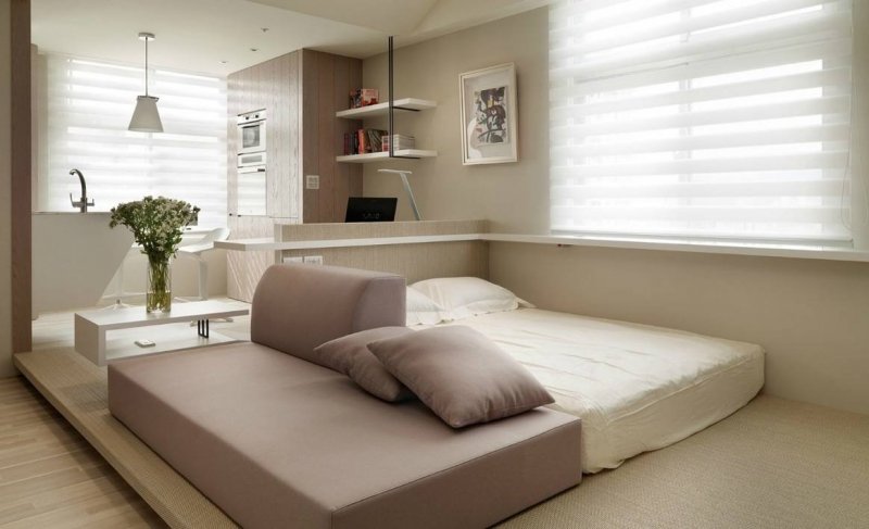 Меблировка и планировка однокомнатного жилья — сложный и трудоемкий процесс. Главная задача заключается в сохранении функционала и свободного пространства при большом количестве мебели. Спальную мебель необходимо установить исходя из этих принципов. Однако нужно придерживаться нескольких правил, актуальных как для обычного однокомнатного жилья, так и для квартир-студий такой же площади. Первый аспект касается использования многофункциональных мебельных элементов. Это кровати с модулями, полками, ящиками, трансформирующиеся спальные места. Второй нюанс — зонирование. Данный прием облегчает ориентирование в пространстве. Комоды, стеллаж или ширма справятся с задачей выделения спальной зоны в квартире-студии. Третьим аспектом является цветовое оформление. Оно способно дополнительно подчеркивать функциональные зоны и визуально увеличивать пространство.