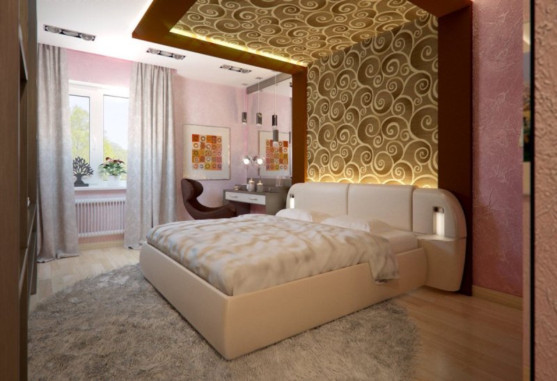 Обустройство помещения начинается с установки кровати. Если комната большая (от 15 кв. м), проблем с выбором места не возникнет, подойдет практически любой уголок или стена. Правильное размещение в помещении меньшего размера позволит соблюсти гармонию с остальной мебелью, визуально увеличить пространство. Перед покупкой мебели меряют параметры, в том числе комнаты. Нужно учитывать, что минимальная дистанция для нормального прохода составляет 70 см. Будет кстати создать схему с планом комнаты. Пространство планируется с запасом, и в первую очередь речь идет о створках окна, распашной двери. В итоге чем меньше свободного места, тем больше кровать тяготеет к стенам. В просторной комнате большого объема или с небольшим количеством мебели дизайн формируется с центром в виде спального места. В таком случае планировка делается максимально симметрической. Также большие помещения позволяют размещать кровать согласно сторон света, как гласит китайская философия фен-шуй.