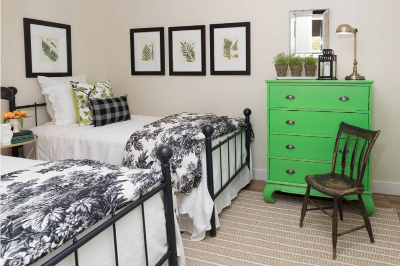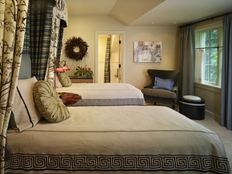 Сначала нужно предусмотреть место для личных вещей тех, кто спит в этой комнате. Для прохода оставляют не меньше чем 60 см. Один из главных способов установки двух кроватей в спальне основывается на симметрии. Понадобятся два стула и пара тумбочек, из расчета, что в спальне будет двое людей. Другой способ заключается в угловом расположении спальных мест. В таком случае больше всего подходит принцип «изголовье к изголовью», реже — «изножье к изножью». Угловая расстановка со свободным углом позволяет хранить в образовавшемся пространстве большое количество предметов. Там же можно установить высокую мебель с закрытыми полками. Четвертый способ — размещение спальной мебели в одну линию вдоль какой-то из стен. Кровати ставятся ровно, изголовьем к изголовью, а сбоку окажется достаточно места для широкого прохода. Во всех вышеперечисленных ситуациях рекомендуется оборудовать спальные места секциями для хранения вещей разных размеров и форм.
