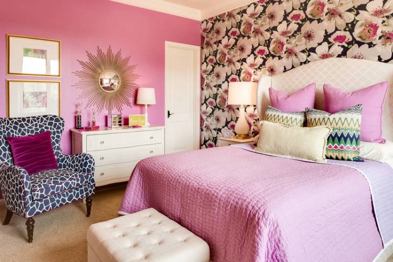 Для этого способа потребуется два вида обоев: простые, однотонные и яркие, с оригинальным рисунком, привлекающие к себе внимание. Первыми оклеивают три стены, а вторыми — оставшуюся четвёртую. Она и станет акцентом, главной изюминкой интерьера. В спальне заостряют внимание на стене, к которой кровать прислоняется изголовьем. В зале это поверхность за спинкой большого дивана. На кухне роль акцентной стены выполняет та, что стала фоном для обеденной группы.