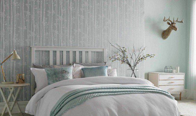 Для этого способа потребуется два вида обоев: однотонные и яркие с рисунком или фактурной поверхностью. Принцип комбинирования заключается в оклеивании противоположных стен одинаковыми обоями. Осторожнее следует быть с комнатами нестандартной конфигурации. Холодные оттенки отдаляют объект, поэтому синие, голубые, зелёные обои не рекомендуется использовать для отделки «коротких» стен, так как помещение станет казаться ещё уже.