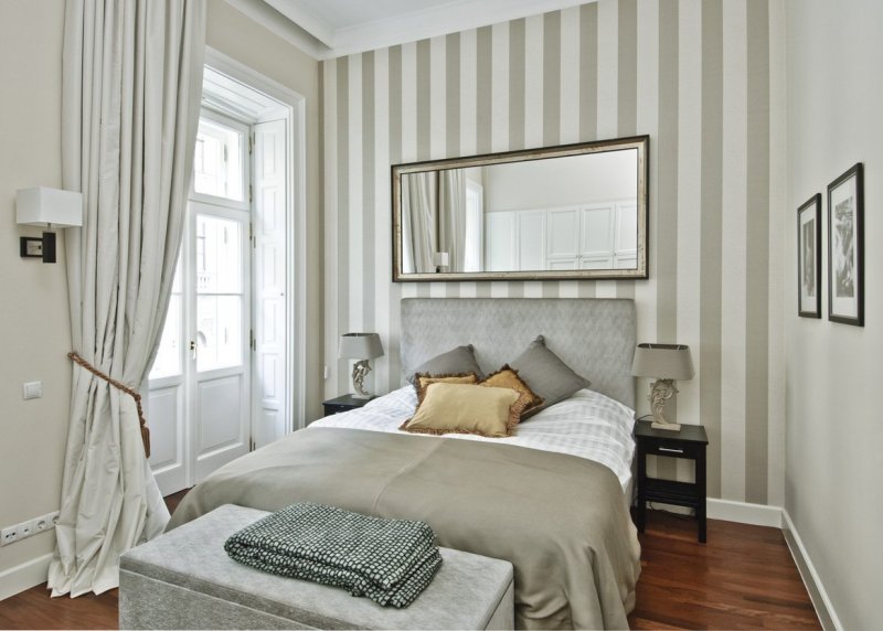 Оклеить одну стену обоями по диагонали — неординарное и смелое решение. Оптимальным вариантом для такого эксперимента станут вертикально-полосатые обои. Необычная стена сильно исказит пространство и оно будет восприниматься совершенно иначе.