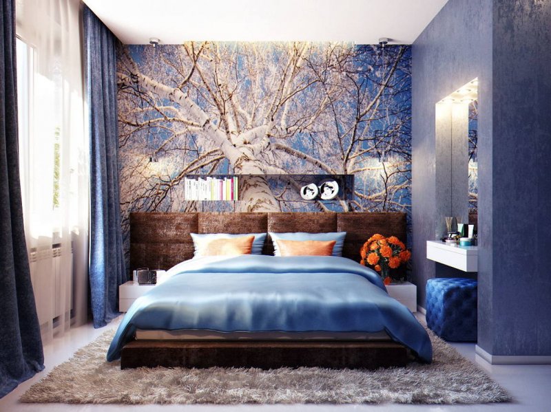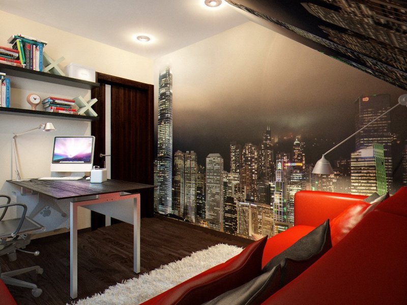 Этот же метод можно использовать в помещениях, которые лишены окон или имеют слишком маленькие проёмы. Если улица может порадовать только унылым пейзажем, то почему бы не заменить его на нарисованный, но более красочный? Фотообоями оклеивают акцентную стену. Лучше выбирать ту поверхность, которая противоположна дверному проёму. Для тесных комнат больше подходят фотообои с изображением природных объектов: бескрайнее море, бурлящий водопад (визуально поднимает потолок), широкое поле с колючими щёточками колосьев, лес, ощетинившийся иголками хвойных веток. Для эклектичных интерьеров, стилей фьюжн и этника подойдут оригинальные изображения хищных животных крупным планом или набор разноцветных фасадов домов в авангардной композиции. Колористика картины должна соответствовать общему цветовому решению.