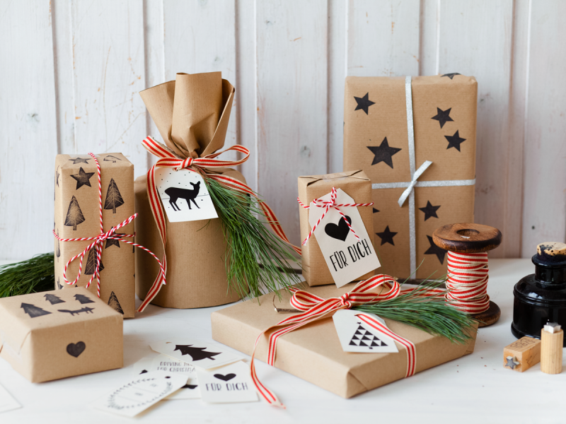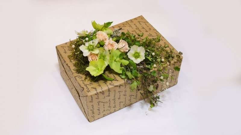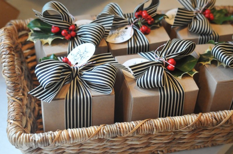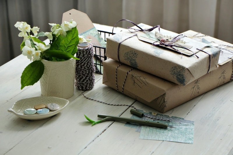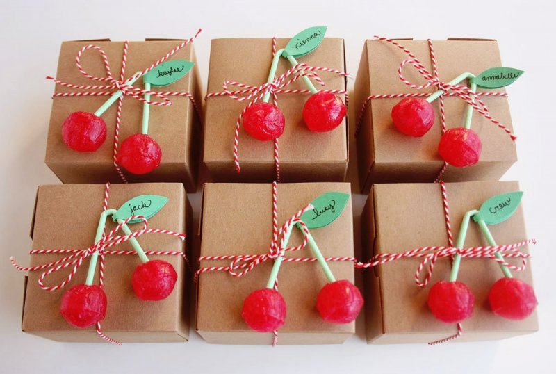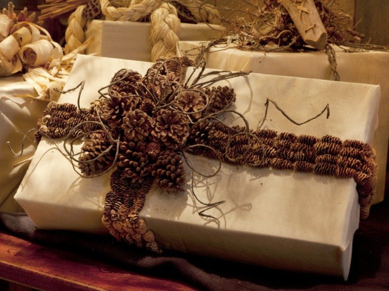 Зимой украшают презенты различными шишками, гроздями рябины, сосновыми веточками. Можно сделать аппликацию из тонких палочек, скорлупы от орехов. Весенний эко стиль подчеркнут живые цветы. Разместить их можно отдельными бутонами или сделать маленькие букетики.