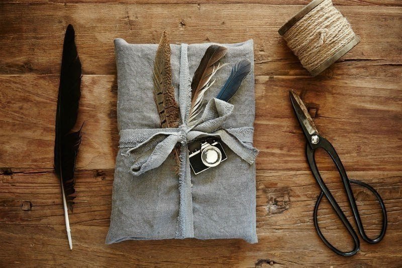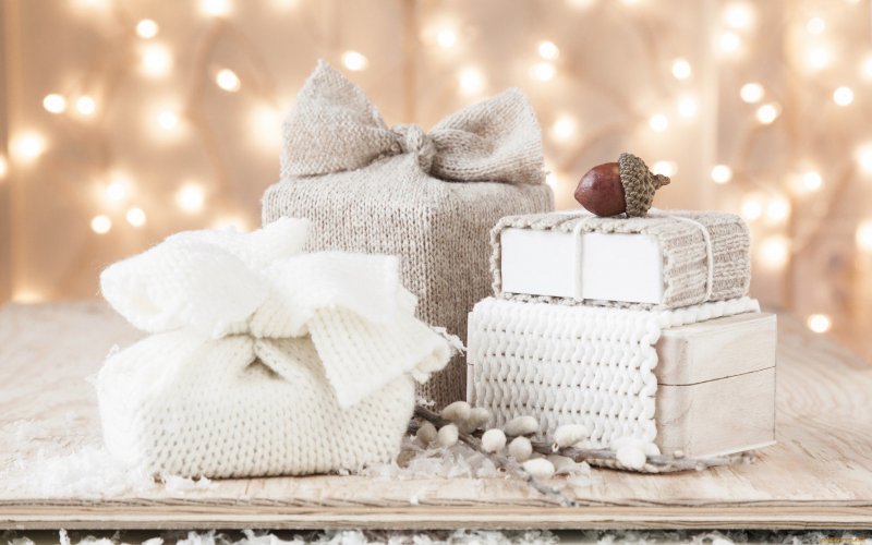 Существует множество техник красивого складывания текстиля: базовый приём, в четыре узла, для цилиндрических предметов, плоских коробок, с двойным обёртыванием. Большой популярностью пользуется вязаная упаковка. Она будет кстати в холодное время года. Это может быть небольшой манжет с запиской, мягкий мешочек.