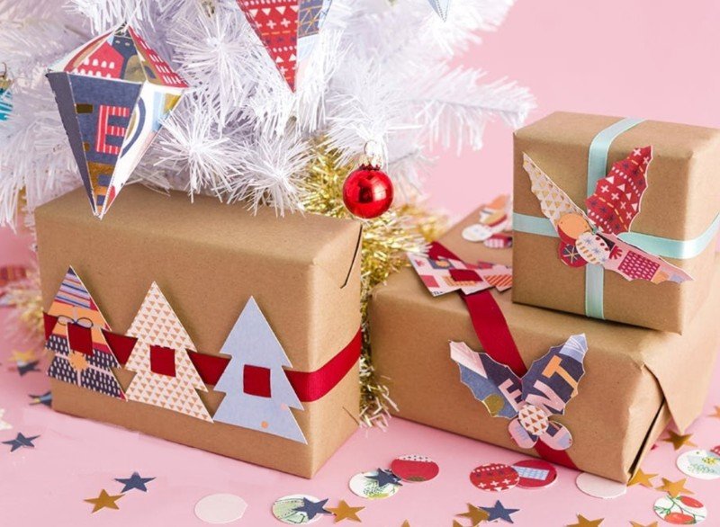 Обычную серую обёртку украсит аппликация из натуральных материалов. Из пряжи можно сделать плоские шапочки Санты и приклеить к лицевой стороне. Для декора детских подарков подойдут леденцы-трости, пряники в виде заснеженного домика. Тёплую упаковку из фетра украсят тематические фигурки из папье-маше, пенопласта. Их можно привязать или приколоть булавками.