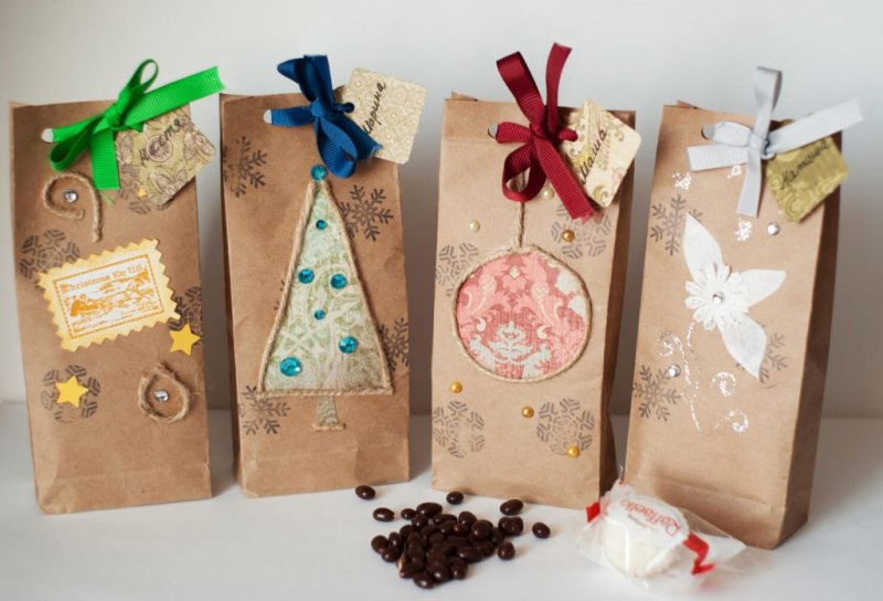 Незабываемые впечатления подарит нарядная упаковка в Новый год. Стандартная обёрточная бумага с зимним рисунком, ленты и банты наверняка уже всем приелись. Добавить волшебства поможет нестандартный подход. Для коллег можно придумать маленькие конвертики с пожеланиями, обмотанные шерстяными нитками. Необычно выглядят мешочки из мешковины с бирками и рождественским декором.