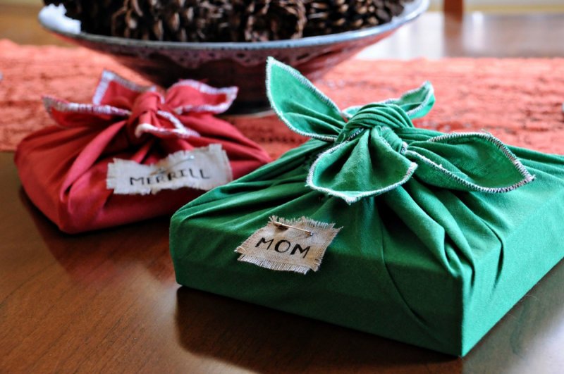 Подарок, обёрнутый тканью, необычно и оригинально выглядит. Можно просто использовать отрезок, обернуть плотную коробку, придать форму узелка или пошить красивый мешочек с застёжкой. В качестве декора используют пуговицы, бирки из фетра, пряжу, ленты. Красиво смотрится плетёная корзинка, обёрнутая льняной тканью. Таким способом можно преподнести презент в виде овощных композиций.