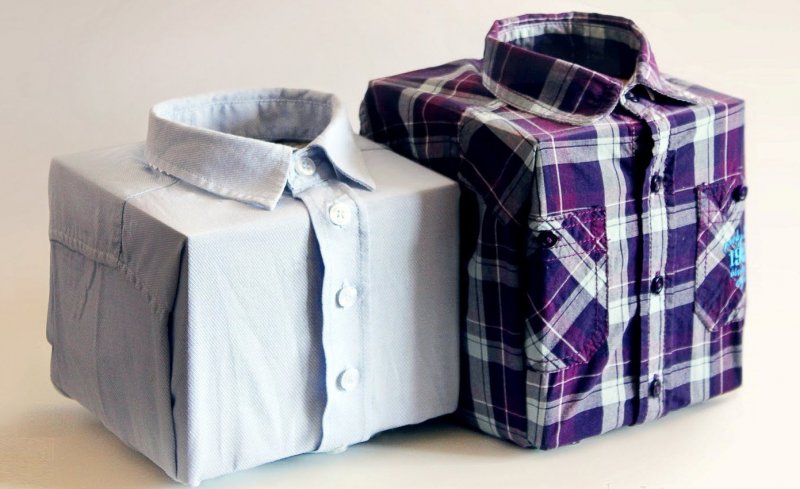 Для небольших презентов упаковку можно сделать самостоятельно из картона в виде красивой рубашки. Скачиваем или перерисовываем шаблон из сети, переносим на картон и вырезаем. Собираем бумагу по намеченным линиям, склеиваем и декорируем. Отлично будут смотреться большие пуговицы и текстильный галстук.