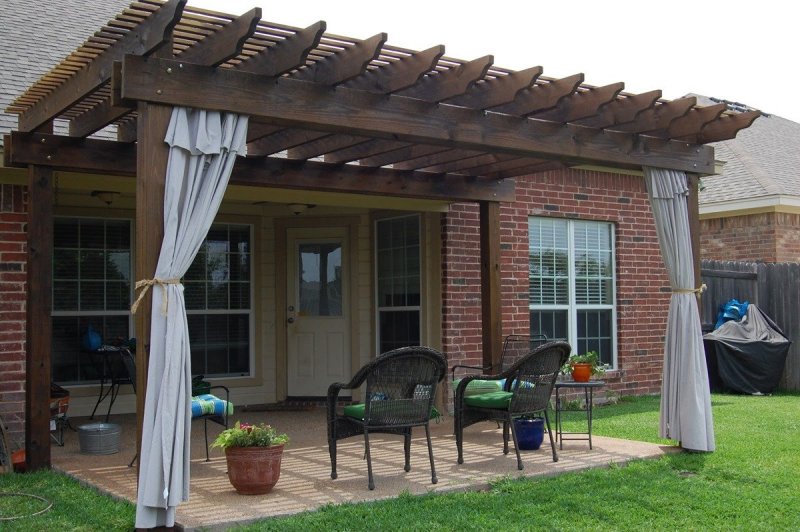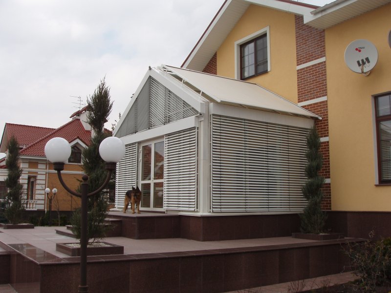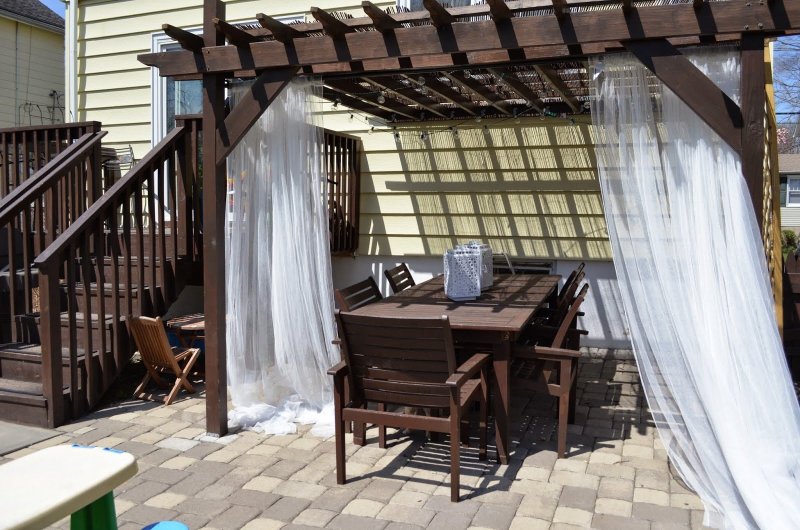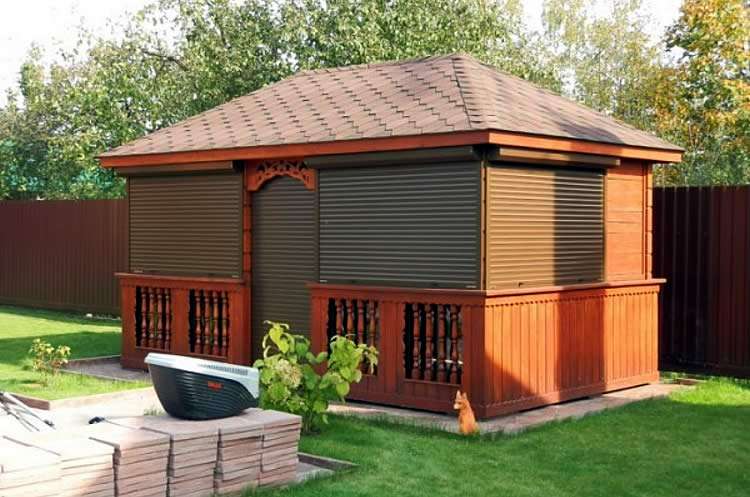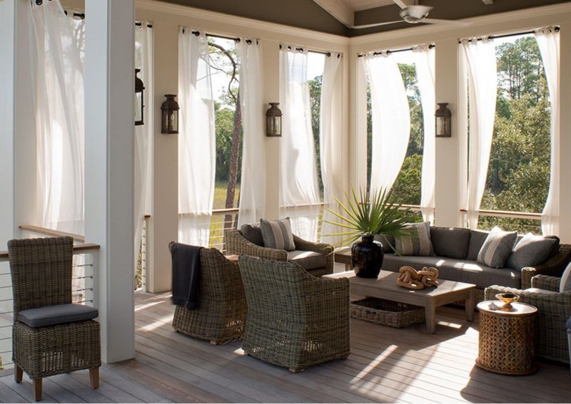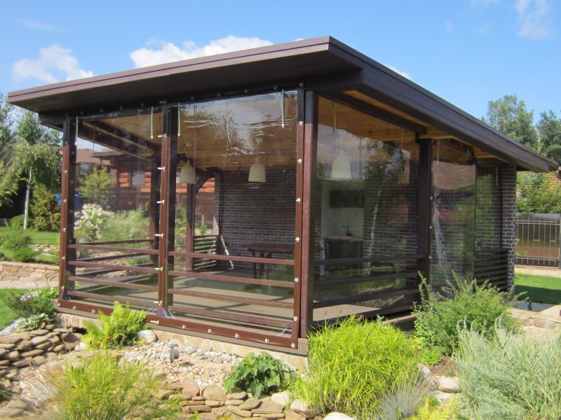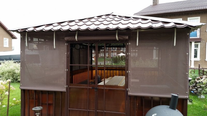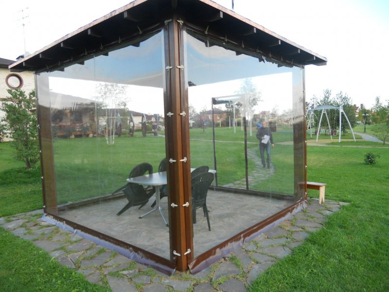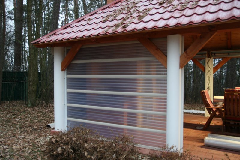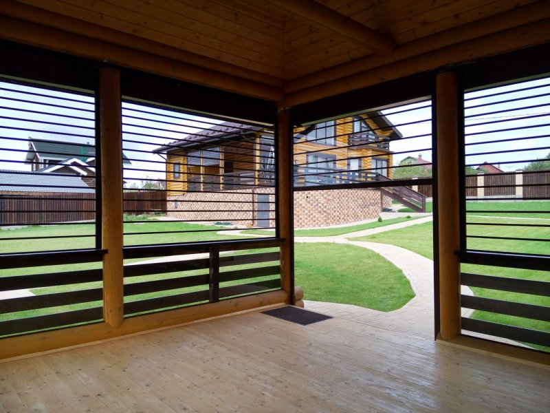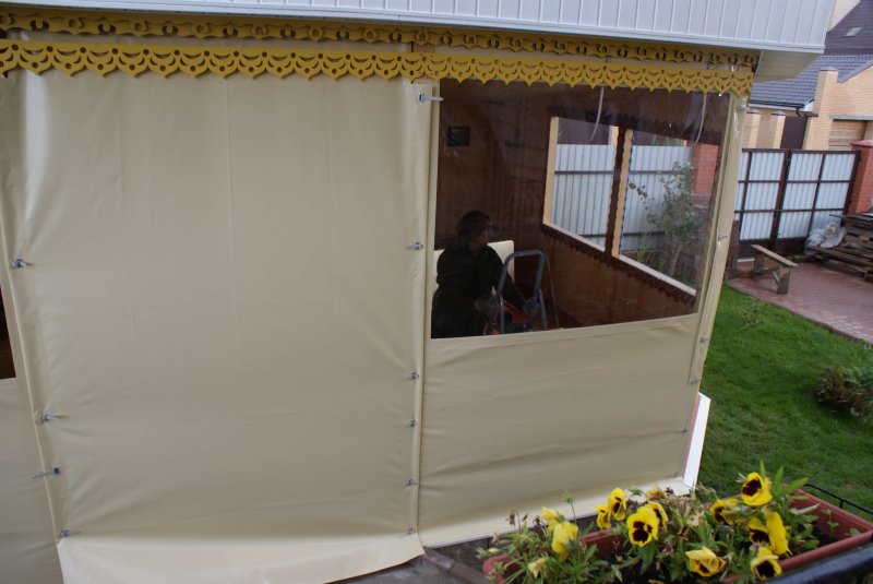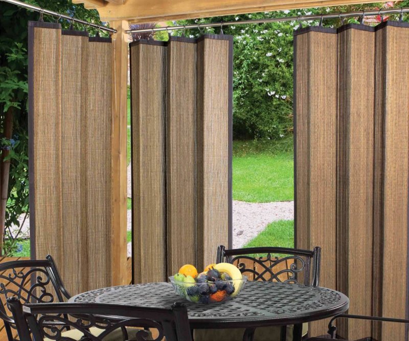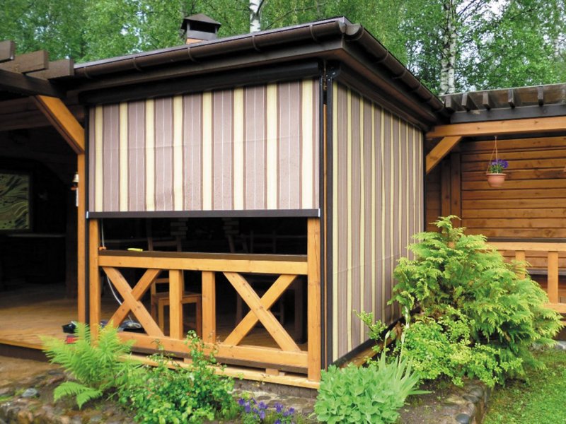 Можно по-разному обустроить веранды и беседки, как открытые, так и застекленные. Используют красивые тканевые, поливинилхлоридные, рулонные, и другие шторы. Изделия придают строению великолепный вид, подчеркивают его дизайн, совместимость с ландшафтом.