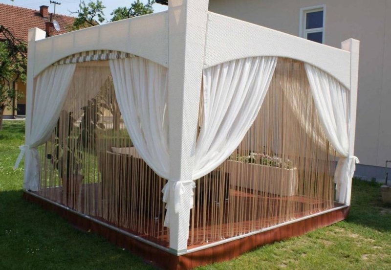 Для придания сооружению уникальности можно совместить несколько разных штор. Отлично будут смотреться белые тканевые занавесы с легкими изделиями из лески, пластика, проволоки.