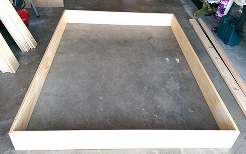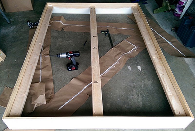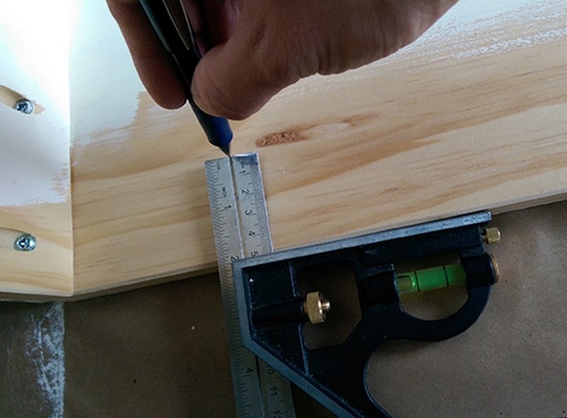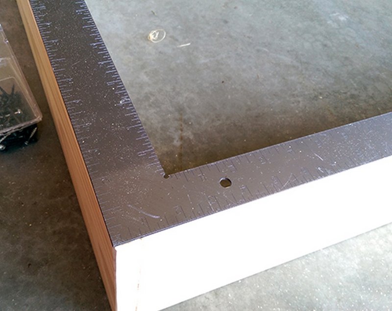 Работу начинают с изготовления рамы – саморезы, соединяющие доски, вкручиваются изнутри под определенным углом, с использованием приспособления Kreg Jig. Все неровности шлифуются, острые углы желательно слегка скруглить, торцы также обработать при помощи шлифовальной машинки. Потом места соединения смазываются клеем, доски скрепляются 30-миллиметровыми саморезами, излишки клея аккуратно удаляются сухой ветошью. Углы должны получиться идеально прямыми – это проверяется прикладыванием угольника к каждому из них.
