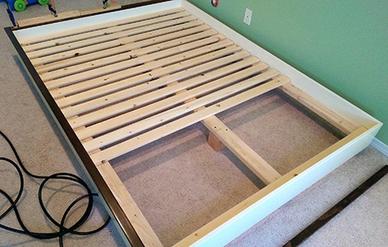Чтобы изготовить опоры донышка кровати, в досках просверливаются направляющие отверстия – от края отступают 5 сантиметров, далее – через каждые 20-25 см. Когда каркас просохнет, его ставят набок, прикрепляют опорные бруски. Для этого при помощи регулируемого угольника чертят линию, отступив от нижнего края основания 50-55 мм. Столярный клей наносят волнообразно, на всю длину брусков, а также на торцы. Далее бруски закрепляются в нужных местах 50-миллиметровыми саморезами, каркас переворачивается, детали прижимаются струбцинами.