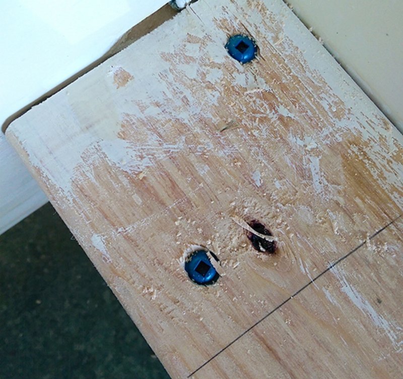 Для качественного закрепления ножек используется по два 60-миллиметровых самореза для каждой, располагаются они по диагонали друг от друга. Чтобы древесина не трескалась, не расщеплялась, перед их вкручиванием требуется под углом просверлить направляющие отверстия.